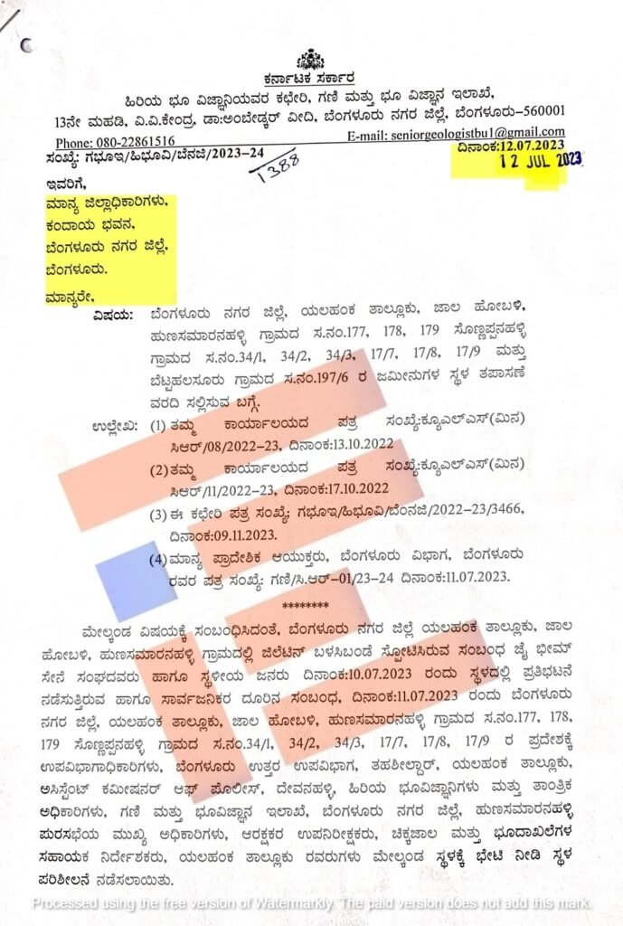 ಬೆಂಗಳೂರು ನಗರ ಜಿಲ್ಲೆಯ ಯಲಹಂಕ ತಾಲೂಕಿನ ಜಾಲ ಹೋಬಳಿಯ ಹುಣಸಮಾರನಹಳ್ಳಿ ಗ್ರಾಮದ ಸರ್ವೇ ನಂಬರ್ 177, 178, 179, ಸೊಣ್ಣಪ್ಪನಹಳ್ಳಿ ಗ್ರಾಮದ ಸರ್ವೆ ನಂಬರ್ 34/1, 34/2, 34/3, 17/1, 17/8, 17/9 ಮತ್ತು ಬೆಟ್ಟಹಲಸೂರು ಗ್ರಾಮದ ಸರ್ವೆ ನಂಬರ್ 197/6ರ ಜಮೀನುಗಳ ತಪಾಸಣೆ ನಡೆಸಿ 2023ರ ಜುಲೈ 12ರಂದು ವರದಿ ಸಲ್ಲಿಸಿದ್ದರು.