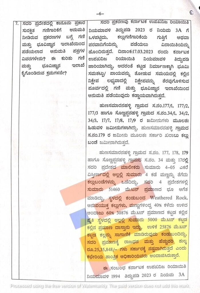 ಉಳಿಕೆ 25,876 ಮೆ.ಟನ್ ಕಟ್ಟಡ ಕಲ್ಲನ್ನು ಸಾಗಾಣಿಕೆ ಮಾಡಿರುವುದು ಕಂಡು ಬಂದಿದ್ದು ಸದರಿ ಪ್ರಮಾಣಕ್ಕೆ ರಾಜಧನ ಮತ್ತು ಹೆಚ್ಚುವರಿ ಶುಲ್ಕ 25,35,848 ರು.ಗಳು ಸರ್ಕಾರಕ್ಕೆ ನಷ್ಟವಾಗಿರುತ್ತದೆ ಎಂದು ಕಚೇರಿಯ ತಾಂತ್ರಿಕ ಅಧಿಕಾರಿಯವರು ಅಂದಾಜಿಸಿದ್ದನ್ನು ವರದಿಯಲ್ಲಿ ಪ್ರಸ್ತಾವಿಸಿದ್ದರು.