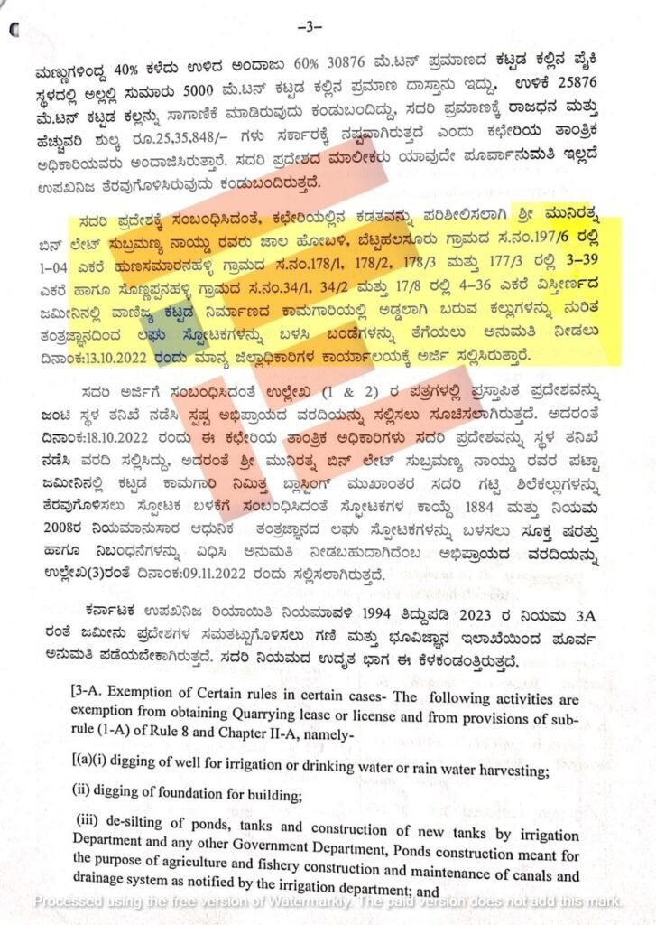 ‘ಜಾಲ ಹೋಬಳಿಯ ಬೆಟ್ಟ ಹಲಸೂರು ಗ್ರಾಮದ ಸರ್ವೆ ನಂಬರ್ 197/6ರಲ್ಲಿ 1.04 ಎಕರೆ, ಹುಣಸಮಾರನಹಳ್ಳಿಯ ಸರ್ವೆ ನಂಬರ್ 178/1, 178/2, 178/3, 177/3 ರಲ್ಲಿ 3.39 ಎಕರೆ ಹಾಗೂ ಸೊಣ್ಣಪ್ಪನಹಳ್ಳಿ ಗ್ರಾಮದ ಸರ್ವೆ ನಂಬರ್ 34/1, 34/2, ಮತ್ತು 17/8ರಲ್ಲಿ 4.36 ಎಕರೆ ವಿಸ್ತೀರ್ಣದ ಜಮೀನಿನ ವಾಣಿಜ್ಯ ಕಟ್ಟಡ ನಿರ್ಮಾಣದ ಕಾಮಗಾರಿಯಲ್ಲಿ ಅಡ್ಡಲಾಗಿ ಬರುವ ಕಲ್ಲುಗಳನ್ನು ನುರಿತ ತಂತ್ರಜ್ಞಾನದಿಂದ ಲಘು ಸ್ಫೋಟಕಗಳನ್ನು ಬಳಸಿ ಬಂಡೆಗಳನ್ನು ತೆಗೆಯಲು ಅನುಮತಿ ನೀಡಬೇಕು,’ ಎಂದು 2022ರ ಅಕ್ಟೋಬರ್ 13ರಂದು ಜಿಲ್ಲಾಧಿಕಾರಿಗಳಿಗೆ ಮುನಿರತ್ನ ಅವರು ಅರ್ಜಿ ಸಲ್ಲಿಸಿದ್ದರು ಎಂಬ ಅಂಶವು ವರದಿಯಿಂದ ಗೊತ್ತಾಗಿದೆ.