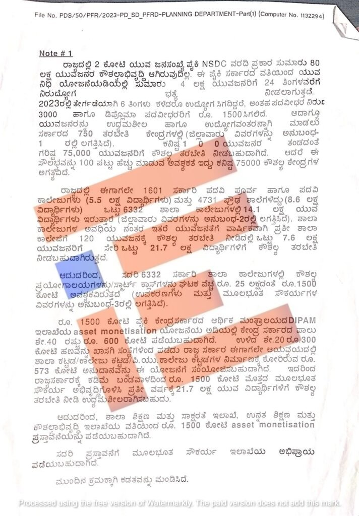 6,332 ಸರ್ಕಾರಿ ಶಾಲಾ ಕಾಲೇಜುಗಳಲ್ಲಿ ಕೌಶಲ್ಯ ಪ್ರಯೋಗಾಲಯಗಳ, ಸ್ಮಾರ್ಟ್ ಕ್ಲಾಸ್ಗಳನ್ನು ಘಟಕ ವೆಚ್ಚ 25 ಲಕ್ಷ ರು,ನಂತೆ ಒಟ್ಟು 1,500 ಕೋಟಿ ರು. ಅವಶ್ಯಕವಿದೆ ಎಂದು ಪ್ರಸ್ತಾವ ಸಲ್ಲಿಸಿದೆ.