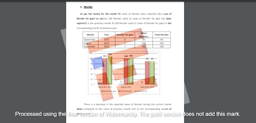 2023ರ ಸೆಪ್ಟಂಬರ್‌ ಅಂತ್ಯಕ್ಕೆ 117 ಕೊಲೆ ಪ್ರಕರಣಗಳು ವರದಿಯಾಗಿವೆ. 2022ರ ಸೆಪ್ಟಂಬರ್‌ನಲ್ಲಿ 111 ಕೊಲೆ ಪ್ರಕರಣಗಳು ದಾಖಲಾಗಿದ್ದವು. 2023ರ ಆಗಸ್ಟ್‌ನಲ್ಲಿ 102 ಕೊಲೆ ಪ್ರಕರಣಗಳು ದಾಖಲಾಗಿದ್ದವು.