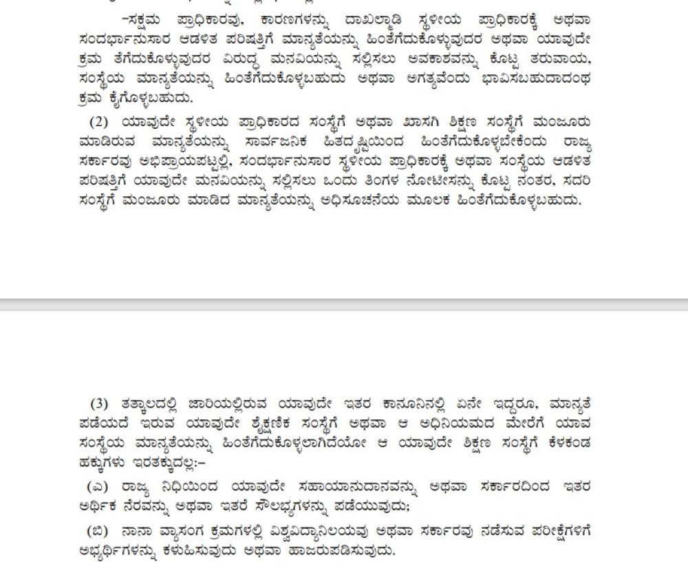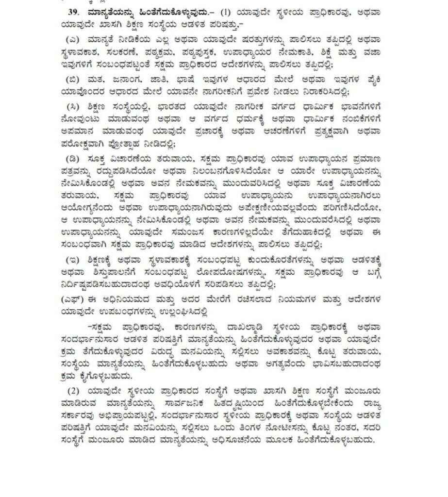 ಯಾವುದೇ ಸ್ಥಳೀಯ ಪ್ರಾಧಿಕಾರದ ಸಂಸ್ಥೆಗೆ ಅಥವಾ ಖಾಸಗಿ ಶಿಕ್ಷಣ ಸಂಸ್ಥೆಗೆ ಮಂಜೂರು ಮಾಡಿರುವ ಮಾನ್ಯತೆಯನ್ನು ಸಾರ್ವಜನಿಕ ಹಿತದೃಷ್ಟಿಯಿಂದ ಹಿಂತೆಗೆದುಕೊಳ್ಳಬೇಕೆಂದು ರಾಜ್ಯ ಸರ್ಕಾರವು ಅಭಿಪ್ರಾಯಪಟ್ಟಲ್ಲಿ ಸಂದಭಾನುಸಾರ ಸ್ಥಳೀಯ ಪ್ರಾಧಿಕಾರಕ್ಕೆ ಅಥವಾ ಸಂಸ್ಥೆಯ ಆಡಳಿತ ಪರಿಷತ್ತಿಗೆ ಯಾವುದೇ ಮನವಿಯನ್ನು ಸಲ್ಲಿಸಲು ಒಂದು ತಿಂಗಳ ನೋಟೀಸ್ನ್ನು ಕೊಟ್ಟ ನಂತರ ಸದರಿ ಸಂಸ್ಥೆಗೆ ಮಂಜೂರು ಮಾಡಿದ ಮಾನ್ಯತೆಯನ್ನು ಅಧಿಸೂಚನೆಯ ಮೂಲಕ ಹಿಂತೆಗೆದುಕೊಳ್ಳಬಹುದು.