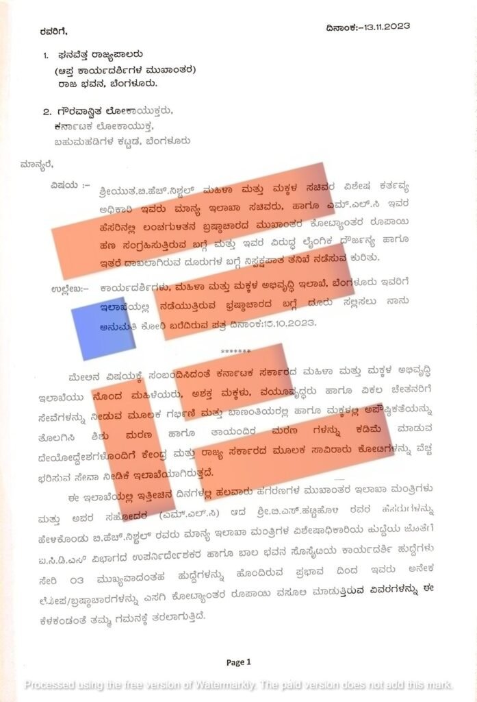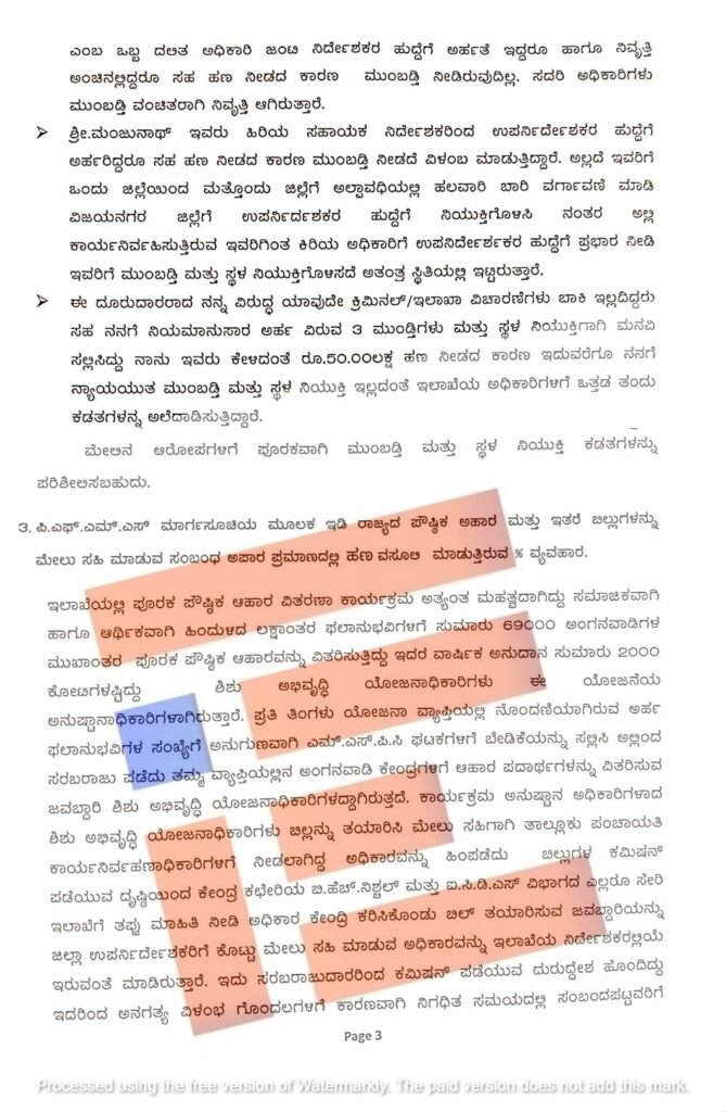 ‘ಬಿಲ್ಗಳ ಕಮಿಷನ್ ಪಡೆಯುವ ದೃಷ್ಟಿಯಿಂದ ಕೇಂದ್ರ ಕಚೇರಿಯ ಬಿ ಹೆಚ್ ನಿಶ್ಚಲ್ ಮತ್ತು ಐಸಿಡಿಎಸ್ ವಿಭಾಗದ ಎಲ್ಲರೂ ಸೇರಿ ಇಲಾಖೆಗೆ ತಪ್ಪು ಮಾಹಿತಿ ನೀಡಿದ್ದಾರೆ. ಅಧಿಕಾರ ಕೇಂದ್ರೀಕರಿಸಿಕಂಡು ಬಿಲ್ ತಯಾರಿಸುವ ಜವಾಬ್ದಾರಿಯನ್ನು ಜಿಲ್ಲಾ ಉಪ ನಿರ್ದೇಶಕರಿಗೆ ಕೊಟ್ಟು ಮೇಲು ಸಹಿ ಮಾಡುವ ಅಧಿಕಾರವನ್ನು ಇಲಾಖೆಯ ನಿರ್ದೇಶಕರಲ್ಲಿಯೇ ಇರುವಂತೆ ಮಾಡಿರುತ್ತಾರೆ. ಇದು ಸರಬರಾಜುದಾರರಿಂದ ಕಮಿಷನ್ ಪಡೆಯುವ ದುರುದ್ದೇಶ ಹೊಂದಿದೆ,’ ಎಂದು ದೂರಿನಲ್ಲಿ ವಿವರಿಸಿರುವುದು ಗೊತ್ತಾಗಿದೆ.