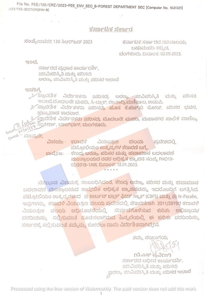 ಪೆಟ್ರೋಲಿಯಂ ಉತ್ಪನ್ನಗಳಾದ ಕಾರ್ಬನ್‌ ಬ್ಲಾಕ್‌ ಫೀಡ್‌ ಸ್ಟಾಕ್‌ ಮತ್ತು ಎನ್‌ ಫ್ಯಾರಾಫಿನ್‌ ಇವುಗಳನ್ನು ಕರಾವಳಿ ನಿಯಂತ್ರಣ ವಲಯ ಪ್ರದೇಶದಲ್ಲಿ ಶೇಖರಣೆಗಾಗಿ 2011/2019ರ ಕರಾವಳಿ ನಿಯಂತ್ರಣ ವಲಯ ಅಧಿಸೂಚನೆಯಲ್ಲಿ ಸೇರ್ಪಡೆಗೊಳಿಸುವ ಕುರಿತು ಅಭಿಪ್ರಾಯ/ವರದಿಯನ್ನು ಸರ್ಕಾರಕ್ಕೆ ಸಲ್ಲಿಸಬೇಕು ಎಂದು ಅರಣ್ಯ,ಜೀವಿ ಪರಿಸ್ಥಿತಿ ಮತ್ತು ಪರಿಸರ ಇಲಾಖೆಯ ಸರ್ಕಾರದ ಪ್ರಧಾನ ಕಾರ್ಯದರ್ಶಿಯು ಪ್ರಾದೇಶಿಕ ನಿರ್ದೇಶಕರಿಗೆ ನಿರ್ದೇಶನ ನೀಡಿರುವುದು ಪತ್ರದಿಂದ ತಿಳಿದು ಬಂದಿದೆ.