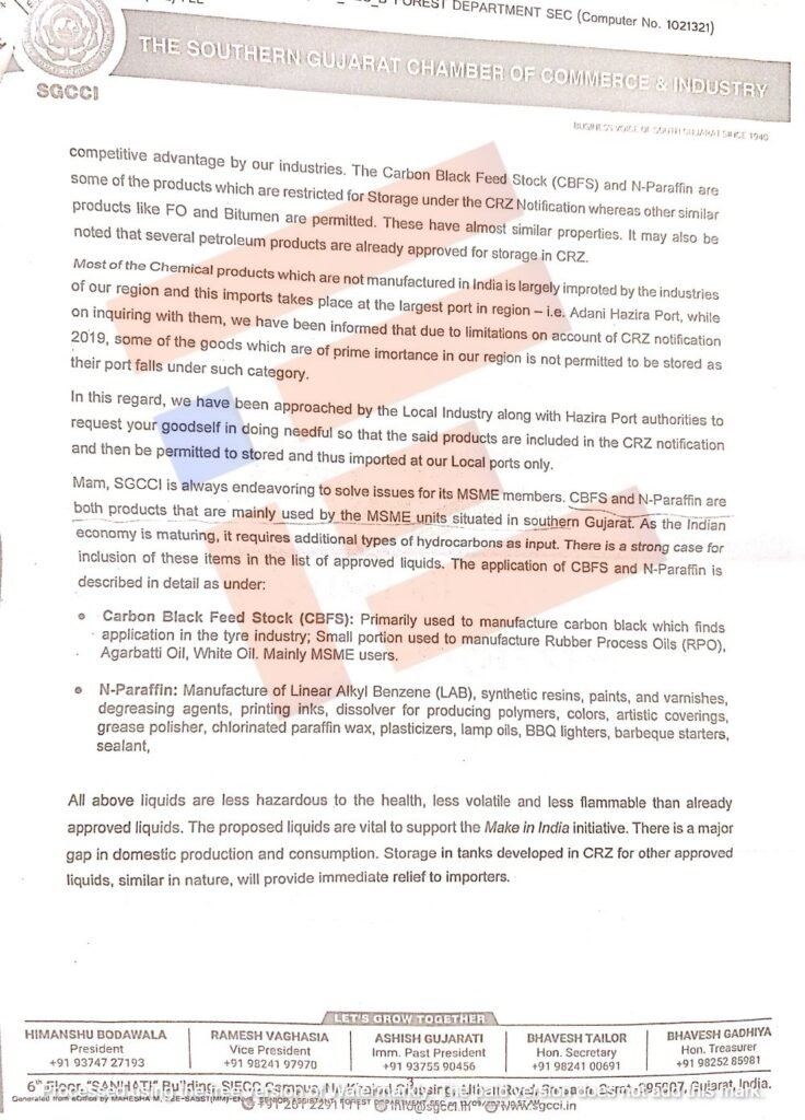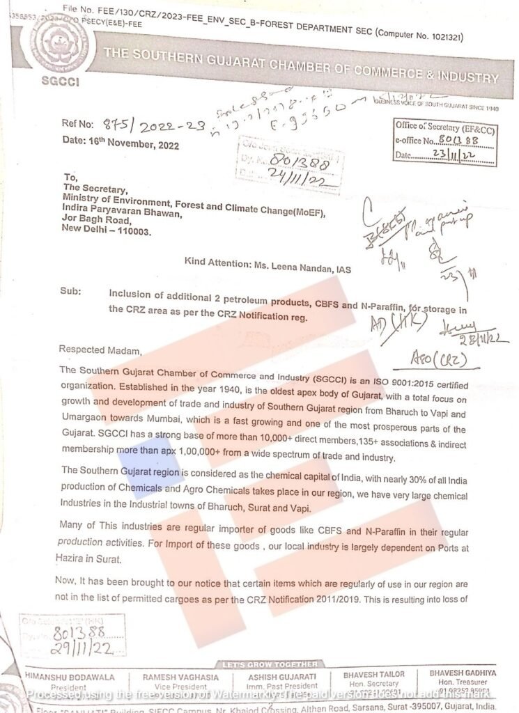ಈ ಮನವಿಯನ್ನಾಧರಿಸಿ ಕ್ರಮಕೈಗೊಳ್ಳಲು ಕೇಂದ್ರ ಸರ್ಕಾರದ ಅರಣ್ಯ ಪರಿಸರ ಸಚಿವಾಲಯಕ್ಕೆ ಸದರನ್‌ ಗುಜರಾತ್‌ ಛೇಂಬರ್‌ ಆಫ್‌ ಕಾಮರ್ಸ್‌ ಇಂಡಸ್ಟ್ರೀಸ್‌ 2022ರ ನವೆಂಬರ್‌ 24ರಂದು ಪತ್ರವನ್ನು ಬರೆದಿತ್ತು.