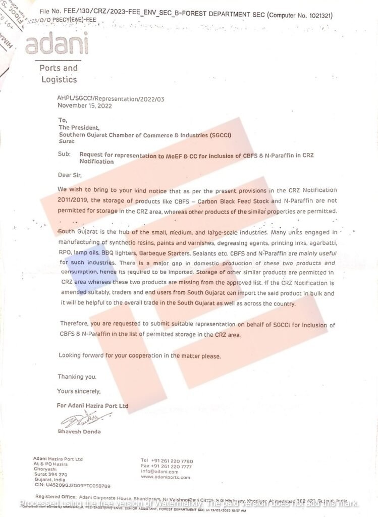 ಪೆಟ್ರೋಲಿಯಂ ಉತ್ಪನ್ನಗಳೊಂದಿಗೆ ಕಾರ್ಬನ್‌ ಬ್ಲಾಕ್‌ ಫೀಡ್‌ ಸ್ಟಾಕ್‌ ಮತ್ತು ಎನ್‌ ಫ್ಯಾರಾಫಿನ್‌ನ್ನು ಕರಾವಳಿ ನಿಯಂತ್ರಣ ವಲಯ ಪ್ರದೇಶದಲ್ಲಿ ಶೇಖರಣೆ ಮಾಡಲು ಅನುಮತಿ ನೀಡಬೇಕು ಮತ್ತು ಸಿಆರ್‌ಝಡ್‌ ಅಧಿಸೂಚನೆ 2019ರಲ್ಲಿ ಸೇರ್ಪಡೆಗೊಳಿಸಬೇಕು ಎಂದು ಅದಾನಿ ಪೋರ್ಟ್ಸ್‌ ಅಂಡ್‌ ಲಾಜಿಸ್ಟಿಕ್ಸ್‌ ಸಂಸ್ಥೆಯು 2022ರ ನವೆಂಬರ್‌ 15ರಂದು ಸದರನ್‌ ಗುಜರಾತ್‌ ಛೇಂಬರ್‌ ಆಫ್‌ ಕಾಮರ್ಸ್‌ ಇಂಡಸ್ಟ್ರೀಸ್‌ ಗೆ ಮನವಿ ಮಾಡಿತ್ತು.