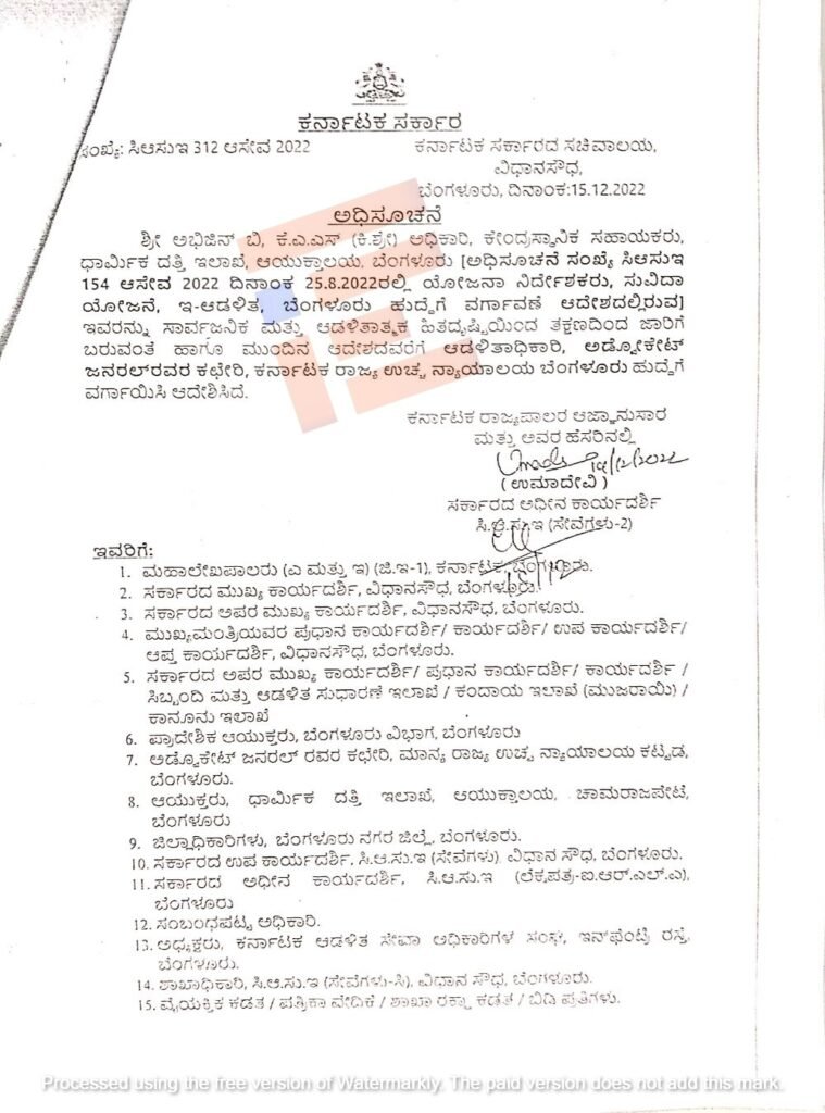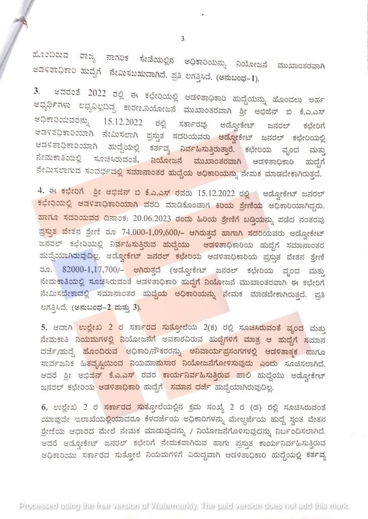 ಅಲ್ಲದೇ ‘ಅಭಿಜಿನ್ ಅವರು ಆಡಳಿತಾಧಿಕಾರಿಯಾಗಿ ನೇಮಕವಾದಾಗ ಕಿರಿಯ ಶ್ರೇಣಿ ಅಧಿಕಾರಿಯಾಗಿದ್ದರು. ಇವರು 2023ರ ಜೂನ್ 20ರಲ್ಲಿ ಹಿರಿಯ ಶ್ರೇಣಿಗೆ ಬಡ್ತಿ ಹೊಂದಿದ್ದಾರೆ. ಇವರ ಪ್ರಸ್ತುತ ವೇತನವು 74,000-1,09,600 ರು. ಇದ.ಎ ಹೀಗಾಗಿ ಅಡ್ವೋಕೇಟ್ ಜನರಲ್ ಕಚೇರಿಯಲ್ಲಿ ನಿರ್ವಹಿಸುತ್ತಿರುವ ಹುದ್ದೆಯ ಆಡಳಿತಾಧಿಕಾರಿ ಹುದ್ದೆಗೆ ಸಮಾನಾಂತರ ಹುದ್ದೆಯಾಗಿರುವುದಿಲ್ಲ.