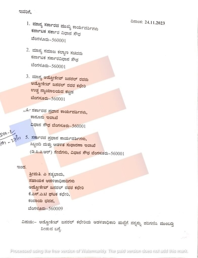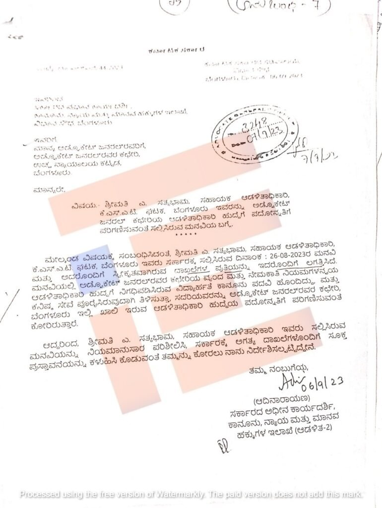 ಈ ಕುರಿತು ಬಾಧಿತ ಮಹಿಳಾ ಅಧಿಕಾರಿಯಾದ ಎ ಸತ್ಯಭಾಮ ಅವರು ಅಡ್ವೋಕೇಟ್ ಜನರಲ್ ಶಶಿಕಿರಣ್ ಶೆಟ್ಟಿ, ಸಮಾಜ ಕಲ್ಯಾಣ ಸಚಿವ ಡಾ ಹೆಚ್ ಸಿ ಮಹದೇವಪ್ಪ, ಮುಖ್ಯ ಕಾರ್ಯದರ್ಶಿ, ಕಾನೂನು ಇಲಾಖೆ, ಸಿಬ್ಬಂದಿ ಆಡಳಿತ ಸುಧಾರಣೆ ಇಲಾಖೆಯ ಸರ್ಕಾರದ ಪ್ರಧಾನ ಕಾರ್ಯದರ್ಶಿಗೆ 2023ರ ನವೆಂಬರ್ 24ರಂದು ದೂರು ಸಲ್ಲಿಸಿದ್ದಾರೆ. ದೂರಿನ ಪ್ರತಿಯು ‘ದಿ ಫೈಲ್’ಗೆ ಲಭ್ಯವಾಗಿದೆ.