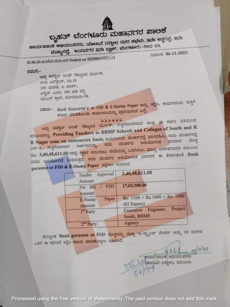 ಅನುಮೋದಿತ ದರಗಳಿಗೆ ಬ್ಯಾಂಕ್ ಗ್ಯಾರಂಟಿ ಮತ್ತು ಇ -ಸ್ಟಾಂಪ್ ಪೇಪರ್ ಸಲ್ಇಸಲು ಬಿಬಿಎಂಪಿಯ ದಕ್ಷಿಣ ವಲಯದ ಕಾರ್ಯಪಾಲಕ ಅಭಿಯಂತರರು 2023ರ ನವೆಂಬರ್ 6ರಂದೇ ಹೊರಗುತ್ತಿಗೆ ಕಂಪನಿಗೆ ಪತ್ರವನ್ನು ಬರೆದಿದ್ದಾರೆ. ಈ ಪತ್ರವು ‘ದಿ ಫೈಲ್’ಗೆ ಲಭ್ಯವಾಗಿದೆ.