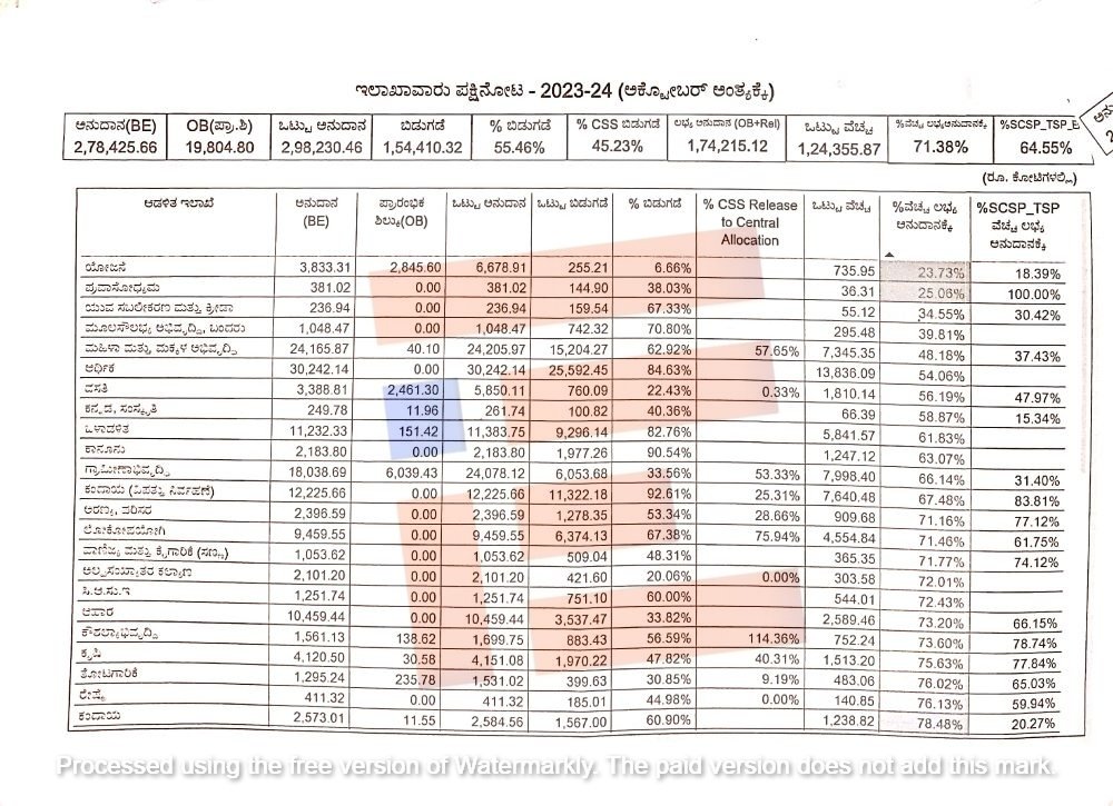 ಸಿದ್ದರಾಮಯ್ಯ ನೇತೃತ್ವದ ಕಾಂಗ್ರೆಸ್‌ ಸರ್ಕಾರದ 2023-24ರ ಬಜೆಟ್‌ನಲ್ಲೇ ಘೋಷಿಸಿದಂತೆ ಹಿಂದಿನ ಸಾಲಿನ ಅನುದಾನದಲ್ಲಿ ಬಳಕೆಯಾಗದೇ ಉಳಿದ ಆರಂಭಿಕ ಶಿಲ್ಕು 19, 804.8 (2023ರ ಅಕ್ಟೋಬರ್‍‌ ಅಂತ್ಯಕ್ಕೆ) ಕೋಟಿಯಷ್ಟು ವಿವಿಧ ಇಲಾಖೆಗಳಲ್ಲಿತ್ತು. ಆ ನಂತರದಲ್ಲಿ ಈ ವರ್ಷ ಇಲಾಖೆಗಳಿಗೆ 2.78 ಲಕ್ಷ ಕೋಟಿ ಬಿಡುಗಡೆ ಮಾಡಬೇಕಿತ್ತು. ಪ್ರಾಥಮಿಕ ಶಿಲ್ಕು ಸೇರಿ ಒಟ್ಟಾರೆ 2,98,230.46 ಕೋಟಿ ರು. ಇದೆ. ಈ ಪೈಕಿ ರೂ.1.54 ಲಕ್ಷ ಕೋಟಿ ಬಿಡುಗಡೆ ಮಾಡಲಾಗಿದೆ ಮತ್ತು 1.24 ಲಕ್ಷ ಕೋಟಿ ಬಿಡುಗಡೆಗೆ ಬಾಕಿ ಇದೆ.