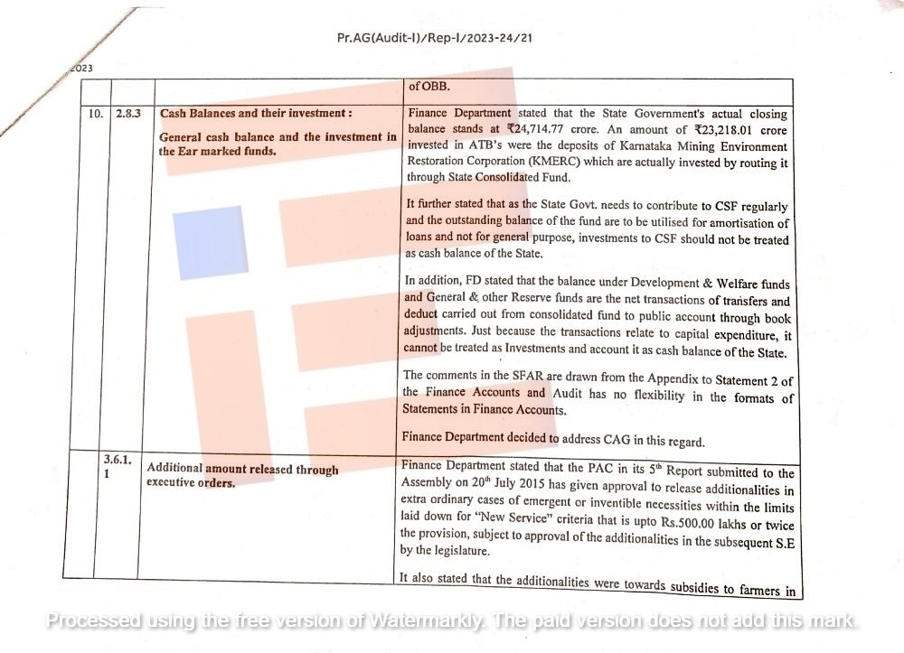 ಸಿಎಜಿ ಕಂಡಿಕೆಯಲ್ಲಿ ನಗದು ಬಾಕಿ (Cash Balance And Their Investment) ಮತ್ತು ಅದರ ಹೂಡಿಕೆ ಕುರಿತು ವಿವರಣೆ ಕೋರಿತ್ತು. ಇದಕ್ಕೆ ಆರ್ಥಿಕ ಇಲಾಖೆಯು ನೀಡಿರುವ ಉತ್ತರದಲ್ಲಿ ನಗದು ಬಾಕಿ ಎಂದು ಉಲ್ಲೇಖಿಸಿಲ್ಲ. ಬದಲಿಗೆ ರಾಜ್ಯ ಸರ್ಕಾರದ ವಾಸ್ತವಿಕ ಮುಕ್ತಾಯ (Closing Balacne) ಬಾಕಿ 24,714.77 ಕೋಟಿ  ಎಂದಷ್ಟೇ ಹೇಳಿರುವುದು (Finance Department stated that the State Government’s actual closing balance stand at 24,714.77 crore) ನಡವಳಿಯಿಂದ ತಿಳಿದು ಬಂದಿದೆ.