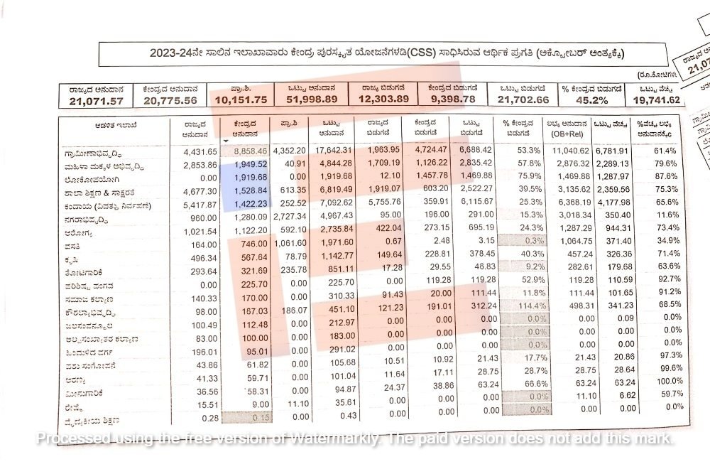 ಕೇಂದ್ರ ಪುರಸ್ಕೃತ ಯೋಜನೆಗಳಡಿ 20,775.56 ಕೋಟಿ ರು. ಮತ್ತು ರಾಜ್ಯದ ಅನುದಾನ 21,071.57 ಕೋಟಿ ರು., ಪ್ರಾಥಮಿಕ ಶಿಲ್ಕು 10,151.75 ಕೋಟಿ ರು. ಸೇರಿ ಒಟ್ಟಾರೆ 51,998.89 ಕೋಟಿ ರು ಇದೆ. ಇದರಲ್ಲಿ ಅಕ್ಟೋಬರ್‍‌ 2023ರ ಅಂತ್ಯಕ್ಕೆ 9,398.78 ಕೋಟಿ ರು. (ಶೇ.45.2) ಬಿಡುಗಡೆ ಮಾಡಿರುವ ಕೇಂದ್ರ ಸರ್ಕಾರವು, ಬಿಡುಗಡೆಗೆ 11,376.78 ಕೋಟಿ ರು. ಬಾಕಿ ಉಳಿಸಿಕೊಂಡಿದೆ.