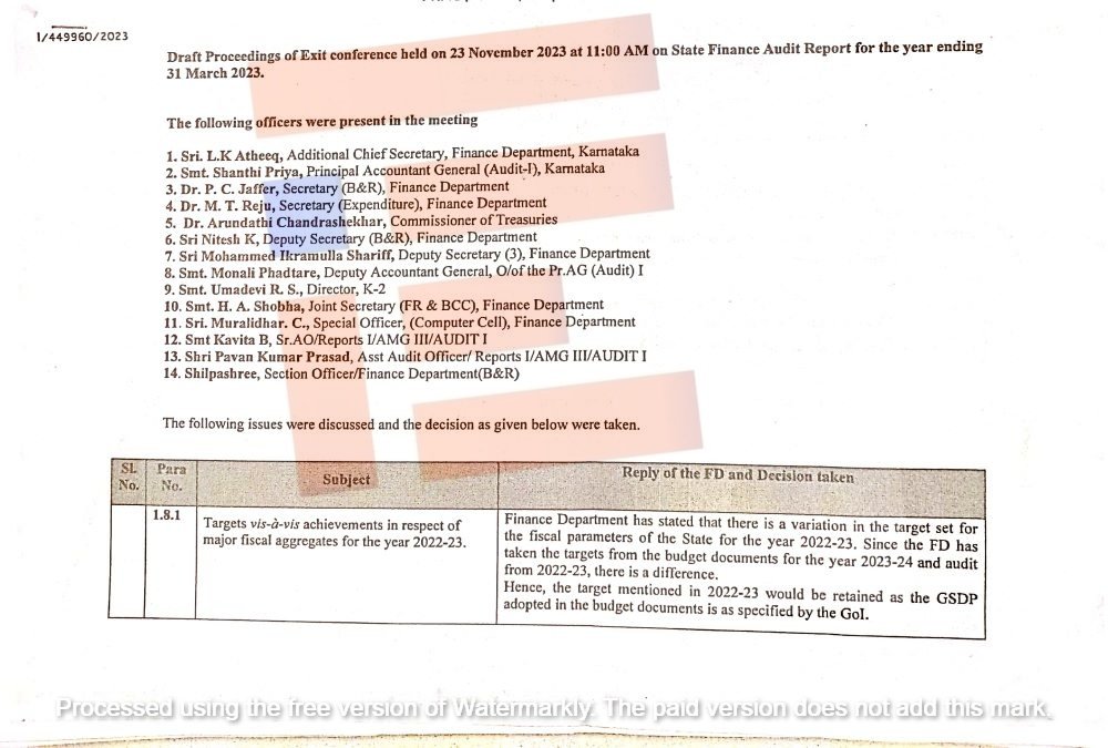 2023ರ ಮಾರ್ಚ್‌ 31ರ ಅಂತ್ಯದವರೆಗಿನ ರಾಜ್ಯ ಹಣಕಾಸು ಲೆಕ್ಕ ಪರಿಶೋಧನೆ ಕುರಿತು ಪ್ರಧಾನ ಮಹಾಲೇಖಪಾಲರಾದ ಶಾಂತಿ ಪ್ರಿಯ ಮತ್ತು ಆರ್ಥಿಕ ಇಲಾಖೆಯ ಸರ್ಕಾರದ ಹೆಚ್ಚುವರಿ ಮುಖ್ಯ ಕಾರ್ಯದರ್ಶಿ ಎಲ್‌ ಕೆ ಅತೀಕ್‌, ಖಜಾನೆ ಇಲಾಖೆಯ ಆಯುಕ್ತರಾದ ಡಾ ಅರುಂಧತಿ ಚಂದ್ರಶೇಖರ್‍‌ ಮತ್ತಿತರರ ಅಧಿಕಾರಿಗಳೊಂದಿಗೆ 2023ರ ನವೆಂಬರ್‍‌ 23ರಂದು ಸಭೆ ನಡೆದಿತ್ತು. ಈ  ಸಭೆಯಲ್ಲಿ ಹಿಂದಿನ ಸರ್ಕಾರದ ಅವಧಿಯ  ಬೊಕ್ಕಸದಲ್ಲಿದ್ದ ನಗದು ಬಾಕಿ ವಿವರಗಳ ಕುರಿತು ಚರ್ಚೆಯಾಗಿದೆ.