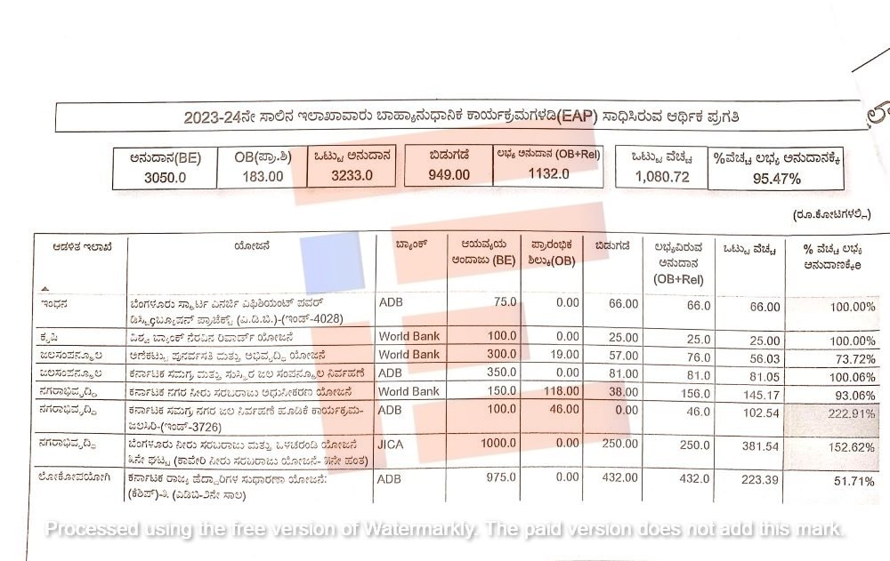 2023-24ನೇ ಸಾಲಿನಲ್ಲಿ ಇಂಧನ, ಕೃಷಿ, ಜಲಸಂಪನ್ಮೂಲ, ನಗರಾಭಿವೃದ್ಧಿ, ಲೋಕೋಪಯೋಗಿ ಇಲಾಖೆಗಳ ಬಾಹ್ಯ ಅನುದಾನಿತ ಕಾರ್ಯಕ್ರಮಗಳಡಿ ಆರಂಭಿಕ ಶಿಲ್ಕು ಸೇರಿ ಒಟ್ಟಾರೆ 3,233.0 ಕೋಟಿ ರು ಅಕ್ಟೋಬರ್‍‌ ಅಂತ್ಯದವರೆಗಿತ್ತು. ಇದರಲ್ಲಿ 949.00 ಕೋಟಿ ರು. ಬಿಡುಗಡೆಯಾಗಿದೆ. 1,132.0 ಕೋಟಿ ರು. ಅನುದಾನ ಲಭ್ಯವಿದೆ. ಅಕ್ಟೋಬರ್‍‌ ಅಂತ್ಯದವರೆಗೆ ಒಟ್ಟಾರೆ 1,080.72 ಕೋಟಿ ರು. ಖರ್ಚಾಗಿದೆ ಎಂದು ತಿಳಿದು ಬಂದಿದೆ.