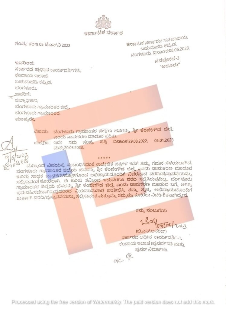 ಬೆಂಗಳೂರು ಗ್ರಾಮಾಂತರ ಜಿಲ್ಲೆಯ ಹೆಸರನ್ನು ಕೆಂಪೇಗೌಡ ಜಿಲ್ಲೆ ಎಂದು ಮರು ನಾಮಕರಣ ಮಾಡುವ ಕುರಿತು ಕಂದಾಯ ಇಲಾಖೆಯು 2023ರ ಜೂನ್‌ 8ರಂದೇ ಬೆಂಗಳೂರು ಗ್ರಾಮಾಂತರ ಜಿಲ್ಲಾಧಿಕಾರಿಗೆ ಪತ್ರ ಬರೆದಿದೆ.