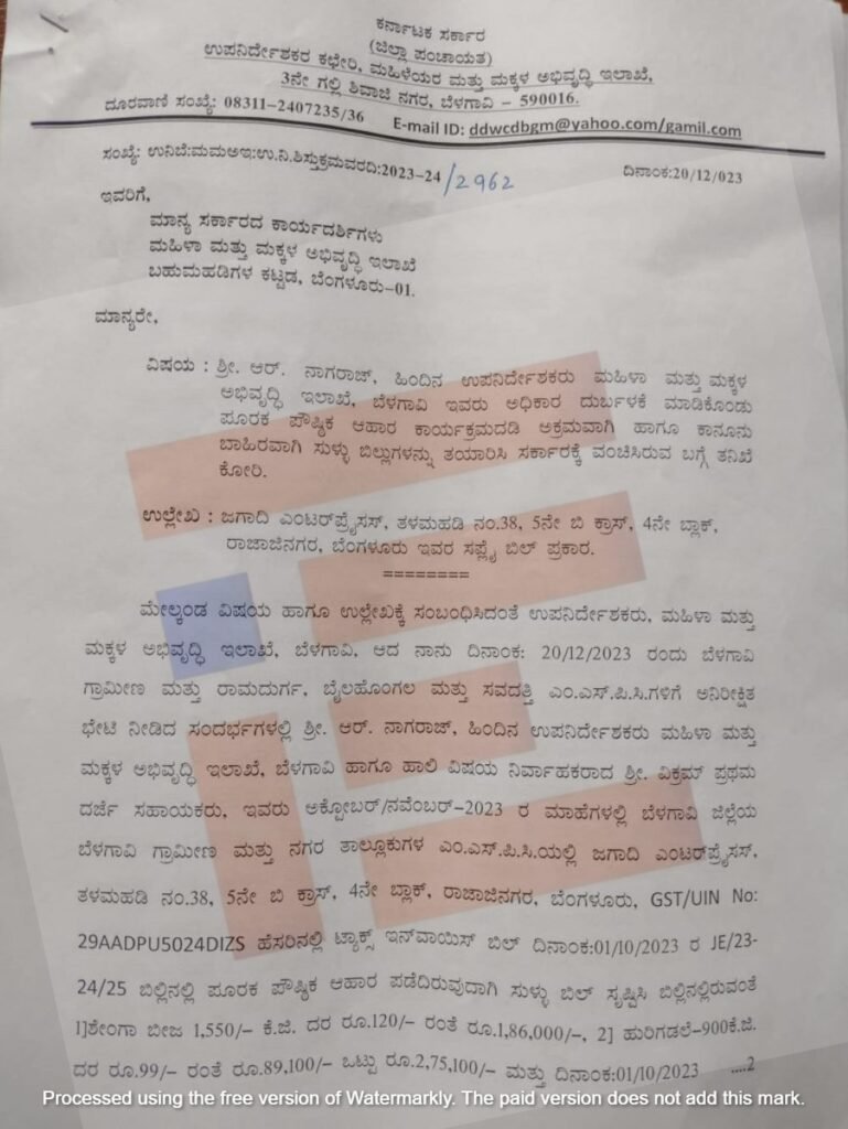 ಬೆಳಗಾವಿ ಜಿಲ್ಲೆಯ ಬೆಳಗಾವಿ ಗ್ರಾಮೀಣ ಮತ್ತು ನಗರ ತಾಲೂಕುಗಳ ಎಂಎಸ್ಪಿಸಿಯಲ್ಲಿ ಬೆಂಗಳೂರಿನ ರಾಜಾಜಿನಗರದ ಜಗಾದಿ ಎಂಟರ್ ಪ್ರೈಸೆಸ್ (ಜಿಎಸ್ಟಿ ನಂ GST/UIN NO 29AADPU5024DIZS) ಹೆಸರಿನಲ್ಲಿ ಟ್ಯಾಕ್ಸ್ ಇನ್ವಾಯ್ಸ್ ಬಿಲ್ನ್ನು 2023ರ ಅಕ್ಟೋಬರ್ 1ರ JE/23-24/25 ಬಿಲ್ನಲ್ಲಿ ಪೂರಕ ಪೌಷ್ಠಿಕ ಆಹಾರ ಪಡೆಯಲಾಗಿದೆ ಎಂದು ನಕಲಿ ಬಿಲ್ ಸೃಷ್ಟಿಸಲಾಗಿದೆ ಎಂದು ಉಪ ನಿರ್ದೇಶಕರು ಬರೆದಿರುವ ಪತ್ರದಲ್ಲಿ ವಿವರಿಸಿದ್ದಾರೆ.