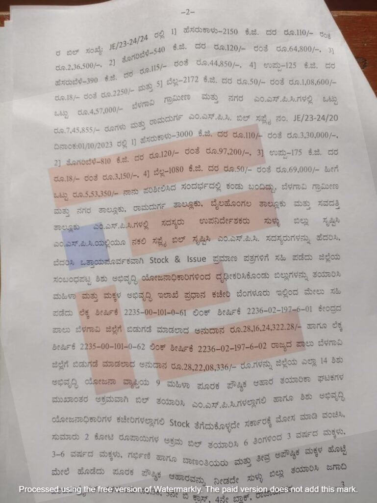 ಕೇಂದ್ರದ ಪಾಲು (ಲೆಕ್ಕ ಶೀರ್ಷಿಕೆ; 2235-00-101-0-61 ಲಿಂಕ್ ಶೀರ್ಷಿಕೆ 2236-02-197-7-01) 28.16 ಕೋಟಿ ರು., ರಾಜ್ಯದ ಪಾಲಿನ 28.22 ಕೋಟಿ ರು.ಗಳು ಬೆಳಗಾವಿ ಜಿಲ್ಲೆಗೆ ಬಿಡುಗಡೆಯಾಗಿತ್ತು. ಈ ಮೊತ್ತವನ್ನು ಬೆಳಗಾವಿ ಜಿಲ್ಲೆಯ 14 ಶಿಶು ಅಭಿವೃದ್ಧಿ ಯೋಜನಾ ವ್ಯಾಪ್ತಿಯ 9 ಮಹಿಳಾ ಪೂರಕ ಪೌಷ್ಠಿಕ ಆಹಾರ ತಯಾರಿಕೆ ಘಟಕಗಳ ಮುಖಾಂತರ ಅಕ್ರಮವಾಗಿ ಬಿಲ್ ತಯಾರಿಸಲಾಗಿತ್ತು ಎಂದು ಪತ್ರದಿಂದ ತಿಳಿದು ಬಂದಿದೆ.