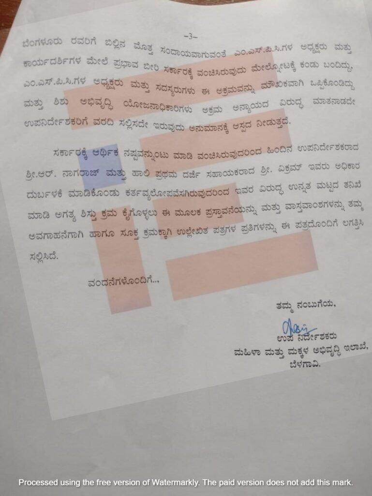 ‘ಬೆಳಗಾವಿ ಗ್ರಾಮೀಣ ಮತ್ತು ನಗರ ತಾಲೂಕು, ರಾಮದುರ್ಗ, ಬೈಲಹೊಂಗಲ, ಸವದತ್ತಿ ತಾಲೂಕಿನ ಎಂಎಸ್ಪಿಸಿಗಳಲ್ಲಿ ಸದಸ್ಯರು, ಉಪ ನಿರ್ದೇಶಕರು ಸುಳ್ಳು ಬಿಲ್ ಸೃಷ್ಟಿಸಲಾಗಿದೆ. ಎಂಎಸ್ಪಿಸಿ ಸದಸ್ಯರನ್ನು ಬೆದರಿಸಿ ಒತ್ತಾಯಪೂರ್ವಕವಾಗಿ ಸ್ಟಾಕ್ ಇಶ್ಯೂ ಪ್ರಮಾಣ ಪತ್ರಗಳಿಗೆ ಸಹಿ ಪಡೆದಿದ್ದಾರೆ. ಸಂಬಂಧಪಟ್ಟ ಶಿಶು ಅಭಿವೃದ್ಧಿ ಯೋಜನಾಧಿಕಾರಿಗಳಿಂದ ದೃಢೀಕರಿಸಿಕೊಂಡು ಬಿಲ್ ತಯಾರಿಸಲಾಗಿದೆ. ಇದಕ್ಕೆ ಮಹಿಳಾ ಮತ್ತು ಮಕ್ಕಳ ಅಭಿವೃದ್ಧಿ ಇಲಾಖೆ ಪ್ರಧಾನ ಕಚೇರಿಯಿಂದ ಮೇಲು ಸಹಿ ಪಡೆಯಲಾಗಿದೆ,’ ಎಂದು ಉಪ ನಿರ್ದೇಶಕರು ತಮ್ಮ ಪತ್ರದಲ್ಲಿ ವಿವರಿಸಿದ್ದಾರೆ.