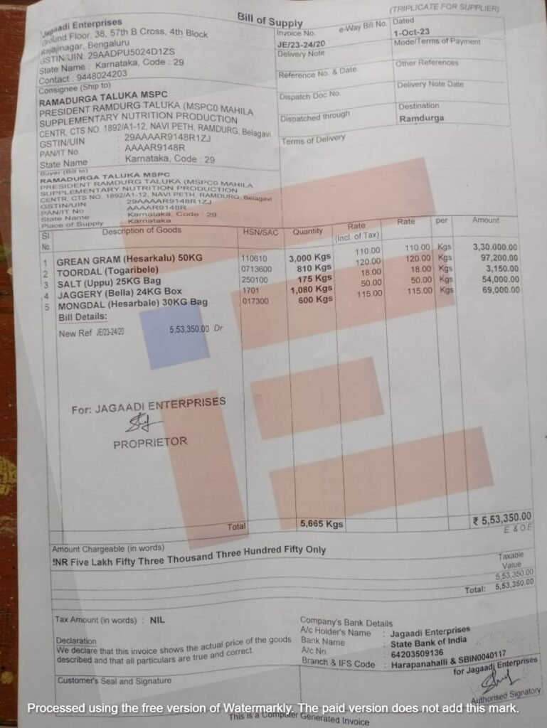 ಶೇಂಗಾ ಬೀಜ, (1,550 ರು) ಕೆ ಜಿ ದರ 120 ರು. ನಂತೆ 1,86,000 ರು., 99 ರು. ನಂತೆ 900 ಕೆ ಜಿ ಹುರಿಗಡಲೆ, 89,100 ಒಟ್ಟು 2,75,100 ರು., 2023ರ ಅಕ್ಟೋಬರ್ 1ರಂದು ಬಿಲ್ ಸಂಖ್ಯೆ (JE/23/24 ) ಕೆ ಜಿ ಗೆ 110 ರು. ದರದಂತೆ 2,150 ಕೆ ಜಿ ಹೆಸರುಕಾಳಿಗೆ 2,36,000 ರು., 120 ರು ದರದಂತೆ 390 ಕೆ ಜಿ ಹೆಸರುಬೇಳೆಗೆ 44,850 ರು., ಕೆ ಜಿ 18 ರು.ನಂತೆ 125 ಕೆ ಜಿ ಉಪ್ಪಿಗೆ 2,250 ರು, ಕೆ ಜಿ 50 ರು,ನಂತೆ 2,172 ಕೆ ಜಿ ಬೆಲ್ಲಕ್ಕೆ 1,08,600 ರು. ಒಟ್ಟು 4,57,000 ರು.ಗಳ ಬಿಲ್ ತಯಾರಿಸಲಾಗಿದೆ ಎಂದು ಪತ್ರದಿಂದ ಗೊತ್ತಾಗಿದೆ.