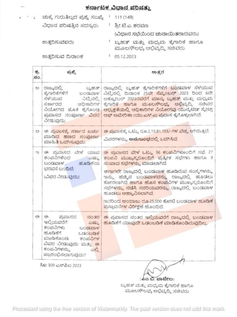 ವಿಧಾನಪರಿಷತ್‌ನಲ್ಲಿ ಸದಸ್ಯ ಟಿ ಎ ಶರವಣ ಅವರು ಕೇಳಿದ್ದ ಪ್ರಶ್ನೆಗೆ ಕೈಗಾರಿಕೆ ಸಚಿವ ಎಂ ಬಿ ಪಾಟೀಲ್‌ ಅವರು ಒದಗಿಸಿರುವ ಉತ್ತರದಲ್ಲಿ ಈ ವಿವರಗಳಿವೆ.