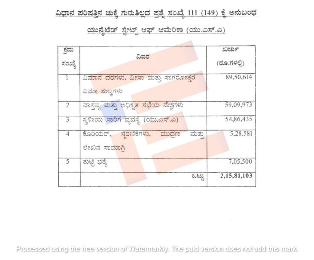 ವಿಮಾನ ದರ, ವೀಸಾ ಮತ್ತು ಸಾಗರೋತ್ತರ ವಿಮಾ ಶುಲ್ಕಗಳಿಗಾಗಿ 89,50,614 ರು. , ವಾಸ್ತವ್ಯ ಮತ್ತು ಅಧಿಕೃತ ಸಭೆಗಳಿಗಾಗಿ 59,09,973 ರು., ಸ್ಥಳೀಯ ಸಾರಿಗೆ ವ್ಯವಸ್ಥೆ (ಯು ಎಸ್‌ ಎ) 54,86,435 ರು., ಕೋರಿಯರ್‌ ಸ್ಮರಣಿಕೆ, ಮುದ್ರಣ ಮತ್ತು ಲೇಖನ ಸಾಮಗ್ರಿಗಳಿಗಾಗಿ 5,28,581 ರು., ತುಟ್ಟಿ ಭತ್ಯೆ 7,05,500 ರು ಸೇರಿದಂತೆ ಒಟ್ಟು 2,15,81,103 ರು. ಖರ್ಚಾಗಿದೆ ಎಂಬ ವಿವರವನ್ನು ಒದಗಿಸಿದ್ದಾರೆ.