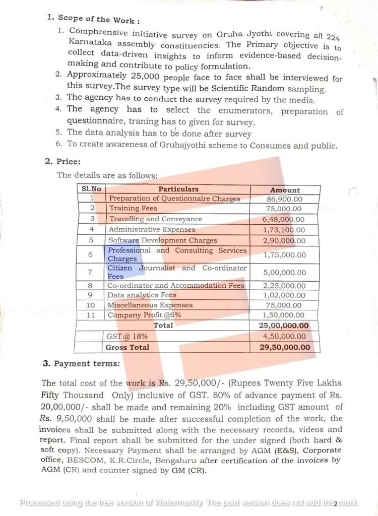 ಬೆಂಗಳೂರು; ಗೃಹ ಜ್ಯೋತಿ ಯೋಜನೆಯ ಸಮೀಕ್ಷೆ ನಡೆಸಲು ಎಂ2ಎಂ ಮೀಡಿಯಾ ನೆಟ್ವರ್ಕ್ ಕಂಪನಿಗೆ ನೀಡಿರುವ ಆದೇಶಕ್ಕೆ ಸಂಬಂಧಿಸಿಂತೆ ಬೆಂಗಳೂರು ವಿದ್ಯುತ್ ಸರಬರಾಜು ಕಂಪನಿಯು ಸಮಗ್ರ ಕಡತವನ್ನು ಒದಗಿಸದೇ ಮುಚ್ಚಿಟ್ಟಿದೆ. ತನ್ನ ಬಳಿ ಕಾರ್ಯಾದೇಶ ಹೊರತುಪಡಿಸಿ ಬೇರಾವುದೇ ದಾಖಲೆಗಳು ಲಭ್ಯವಿಲ್ಲ ಎಂದು ಆರ್ಟಿಐ ಅಡಿಯಲ್ಲಿ ಹಿಂಬರಹ ನೀಡಿದೆ.