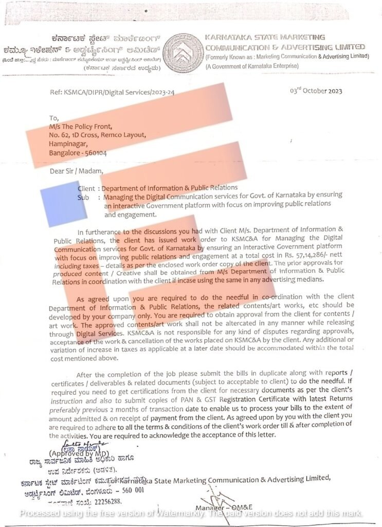 ಸುಳ್ಳು ಸುದ್ದಿಗಳನ್ನು ತಡೆಗಟ್ಟುವಿಕೆ ಮತ್ತು ಸರ್ಕಾರದ ಸಾಧನೆ, ಯೋಜನೆಗಳ ಮಾಹಿತಿಗಳನ್ನು ಸಾಮಾಜಿಕ ಜಾಲತಾಣಗಳಲ್ಲಿ ಪ್ರಚಾರ, ನಿರ್ವಹಣೆ ಮಾಡಲು ಕೆಎಸ್ಎಂಸಿ ಅಂಡ್ ಎ ಮೂಲಕ ‘ದ ಪಾಲಿಸಿ ಫ್ರಂಟ್’ ಗೆ ತಿಂಗಳಿಗೆ 60 ಲಕ್ಷ ರು.ನಂತೆ ಒಂದು ವರ್ಷಕ್ಕೆ 7.20 ಕೋಟಿ ರು. ಗುತ್ತಿಗೆ ನೀಡಲಾಗಿತ್ತು. ಈ ಸಂಬಂಧ ‘ದಿ ಫೈಲ್’ ಆರ್ಟಿಐ ಅಡಿ ಸಲ್ಲಿಸಿದ್ದ ಅರ್ಜಿಗೆ ಕೆಎಸ್ಎಂಸಿ ಅಂಡ್ ಎ ಯು ಕಡತವನ್ನು ಒದಗಿಸಿರಲಿಲ್ಲ. ಬದಲಿಗೆ ಕೇವಲ ಕಾರ್ಯಾದೇಶ ನೀಡಿ ಕೈತೊಳೆದುಕೊಂಡಿತ್ತು.