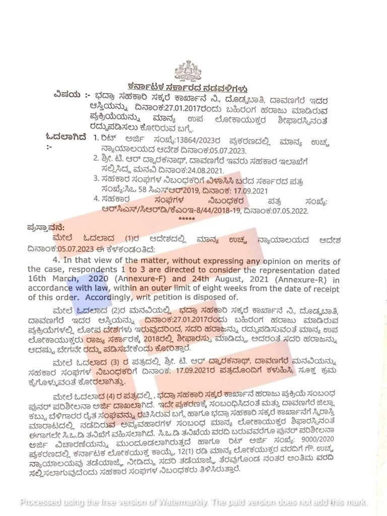 ‘ಭದ್ರಾ ಸಹಕಾರಿ ಸಕ್ಕರೆ ಕಾರ್ಖಾನೆಯ ಪ್ರಕರಣಕ್ಕೆ ಸಂಬಂಧಿಸಿದಂತೆ ಸಿಒಡಿ ತನಿಖೆಯ ವರದಿ ಬರುವವರೆಗೂ ಹಾಗೂ ಉಚ್ಛ ನ್ಯಾಯಾಲಯದ ರಿಟ್‌ ಅರ್ಜಿ ಸಂಖ್ಯೆ 9000/2020 ಪ್ರಕರಣದ ಅಂತಿಮ ಆದೇಶ ಬರುವವರೆಗೂ ಟಿ ಆರ್‍‌ ದ್ವಾರಕನಾಥ್‌ ಅವರ ಮನವಿ ಪರಿಗಣಿಸಿ ಅವರ ಕೋರಿಕೆಯಂತೆ ಕ್ರಮ ಕೈಗೊಳ್ಳಲು ಸಾಧ್ಯವಿಲ್ಲ,’ ಎಂದು ಮನವಿಯನ್ನು ವಿಲೇಗೊಳಿಸಿ ಆದೇಶಿಸಿರುವುದು ಗೊತ್ತಾಗಿದೆ.