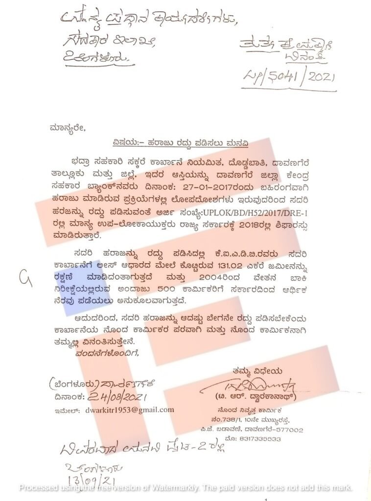 ಭದ್ರಾ ಸಹಕಾರಿ ಸಕ್ಕರೆ ಕಾರ್ಖಾನೆಯ ಆಸ್ತಿಯನ್ನು ದಾವಣಗೆರೆ ಜಿಲ್ಲಾ ಕೇಂದ್ರ ಸಹಕಾರ ಬ್ಯಾಂಕ್‌ 2017ರ ಜನವರಿ 27ರಂದು ಬಹಿರಂಗವಾಗಿ ನಡೆಸಿದ್ದ ಹರಾಜು ಪ್ರಕ್ರಿಯೆಯಲ್ಲಿ ಲೋಪದೋಷಗಳು ಕಂಡು ಬಂದಿವೆ. ಈ ಹರಾಜನ್ನು ರದ್ದುಪಡಿಸಬೇಕು ಎಂದು (ಅರ್ಜಿ ಸಂಖ್ಯೆ; UPLOK/BD/HS52/2017/DRE-1) ಅಂದಿನ ಉಪ ಲೋಕಾಯುಕ್ತರು ರಾಜ್ಯ ಸರ್ಕಾರಕ್ಕೆ 2018ರಲ್ಲೇ ಶಿಫಾರಸ್ಸು ಮಾಡಿದ್ದರು.
