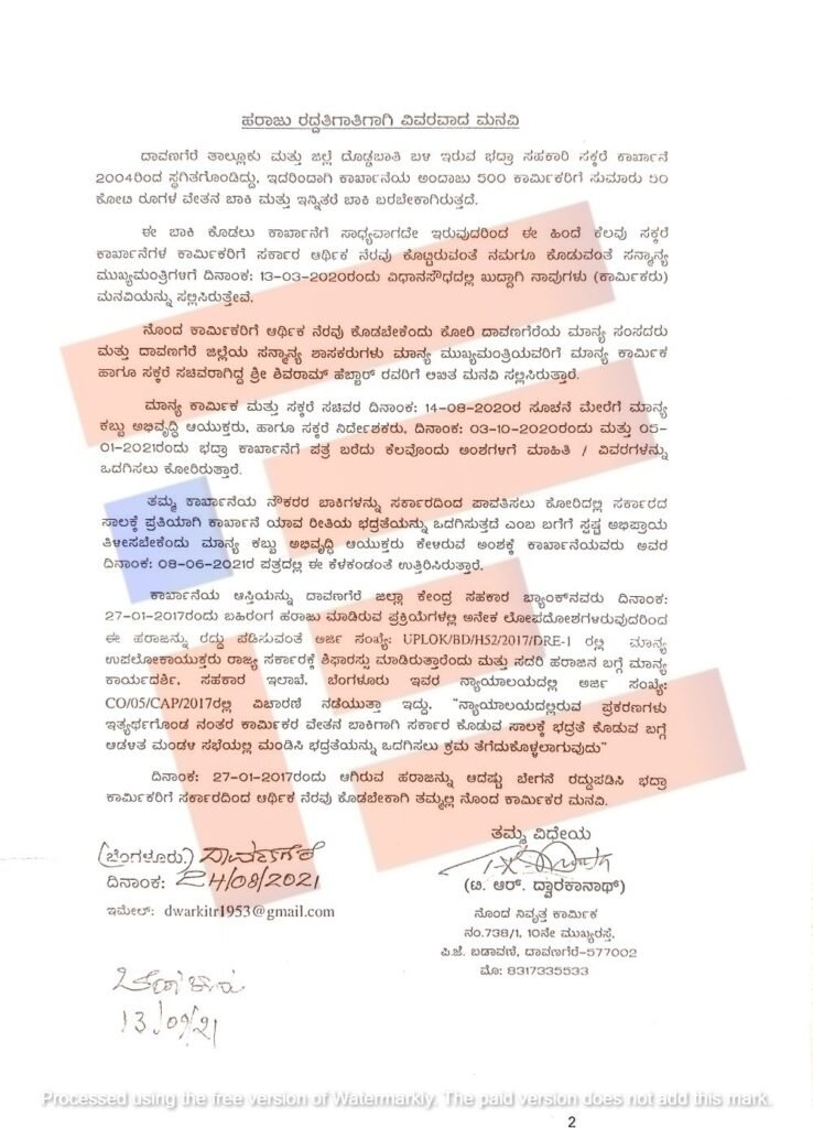 ಬೆಂಗಳೂರು; ದಾವಣಗೆರೆಯ ದೊಡ್ಡಬಾತಿಯಲ್ಲಿರುವ ಭದ್ರಾ ಸಹಕಾರಿ ಸಕ್ಕರೆ ಕಾರ್ಖಾನೆ ಮತ್ತು ಅದರ ಆಸ್ತಿಯನ್ನು ಬಹಿರಂಗ ಹರಾಜು ರದ್ದುಪಡಿಸಬೇಕು ಎಂದು ಕಾರ್ಮಿಕರ ಮನವಿಗೆ ಈಗಿನ ಕಾಂಗ್ರೆಸ್‌ ಸರ್ಕಾರ ಓಗೊಟ್ಟಿಲ್ಲ.