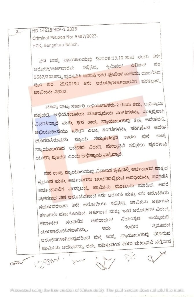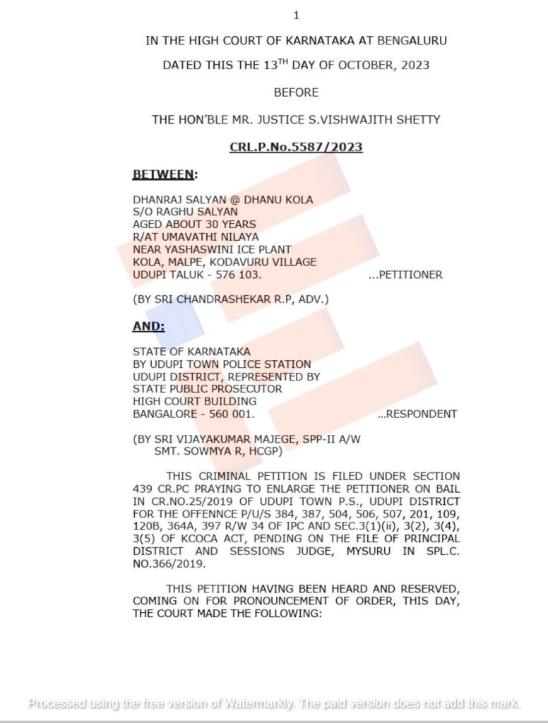 ಈ ಕುರಿತು ಅರ್ಜಿಯನ್ನು ಆಲಿಸಿದ್ದ ನ್ಯಾಯಮೂರ್ತಿ ಎಸ್ ವಿಶ್ವಜಿತ್ ಶೆಟ್ಟಿ ಅವರ ನೇತೃತ್ಚದ ಪೀಠವು 2023ರ ಅಕ್ಟೋಬರ್ 13ರಂದು ಐದನೆ ಆರೋಪಿಯಾಗಿರುವ ಧನರಾಜ್ ಸಾಲಿಯಾನ್ ಎಂಬಾತನಿಗೆ ಷರತ್ತು ಬದ್ಧ ಜಾಮೀನು ನೀಡಿ ಆದೇಶಿಸಿತ್ತು.