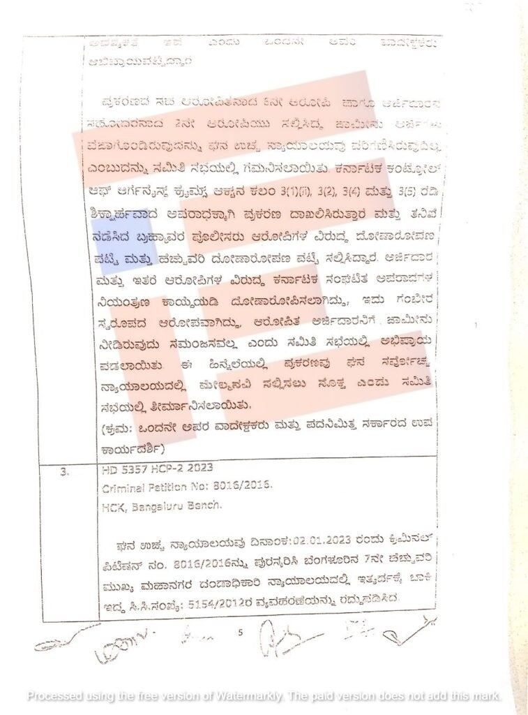 ‘ಇದು ಗಂಭೀರ ಸ್ವರೂಪವಾಗಿದ್ದು ಆರೋಪಿತ ಅರ್ಜಿದಾರನಿಗೆ ಜಾಮೀನು ನೀಡಿರುವುದು ಸಮಂಜಸವಲ್ಲ ಎಂದು ಸಮಿತಿ ಸಭೆಯಲ್ಲಿ ಅಭಿಪ್ರಾಯಪಡಲಾಯಿತು. ಈ ಹಿನ್ನೆಲೆಯಲ್ಲಿ ಪ್ರಕರಣವು ಸರ್ವೋಚ್ಚ ನ್ಯಾಯಾಲಯದಲ್ಲಿ ಮೇಲ್ಮನವಿ ಸಲ್ಲಿಸಲು ಸೂಕ್ತ,’ ಎಂದು ಸಮಿತಿ ಸಭೆಯಲ್ಲಿ ತೀರ್ಮಾನಿಸಿರುವುದು ನಡವಳಿಯಿಂದ ತಿಳಿದು ಬಂದಿದೆ.