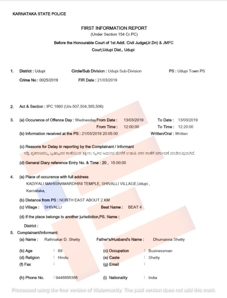 ಇದನ್ನಾಧರಿಸಿ ಉಡುಪಿ ಪೊಲೀಸರು ಐಪಿಸಿ 1860 (384,385, 387 507, 504, 506, 201, 109, 120(ಬಿ) 364 ಎ, 397, ) ಮತ್ತು ಕೋಕಾ ಅಡಿಯಲ್ಲಿ ಮೊಕದ್ದಮೆ ದಾಖಲಿಸಿಕೊಂಡಿದ್ದರು.