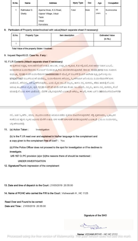 ಈ ಪ್ರಕರಣದ ಕುರಿತು ತನಿಖೆ ನಡೆಸಿದ್ದ ಬ್ರಹ್ಮಾವರ ಪೊಲೀಸರು ಆರೋಪಿಗಳ ವಿರುದ್ಧ ದೋಷಾರೋಪಣೆ ಮತ್ತು ಹೆಚ್ಚುವರಿ ದೋಷಾರೋಪಣೆ ಪಟ್ಟಿ ಸಲ್ಲಿಸಿದ್ದಾರೆ. ಅರ್ಜಿದಾರ ಮತ್ತು ಇತರೆ ಆರೋಪಿಗಳ ವಿರುದ್ಧ ಕರ್ನಾಟಕ ಸಂಘಟಿತ ಅಪರಾಧಗಳ ನಿಯಂತ್ರಣ ಕಾಯ್ದೆಯಡಿ ದೋಷಾರೋಪಿಸಿರುವುದು ಗೊತ್ತಾಗಿದೆ.