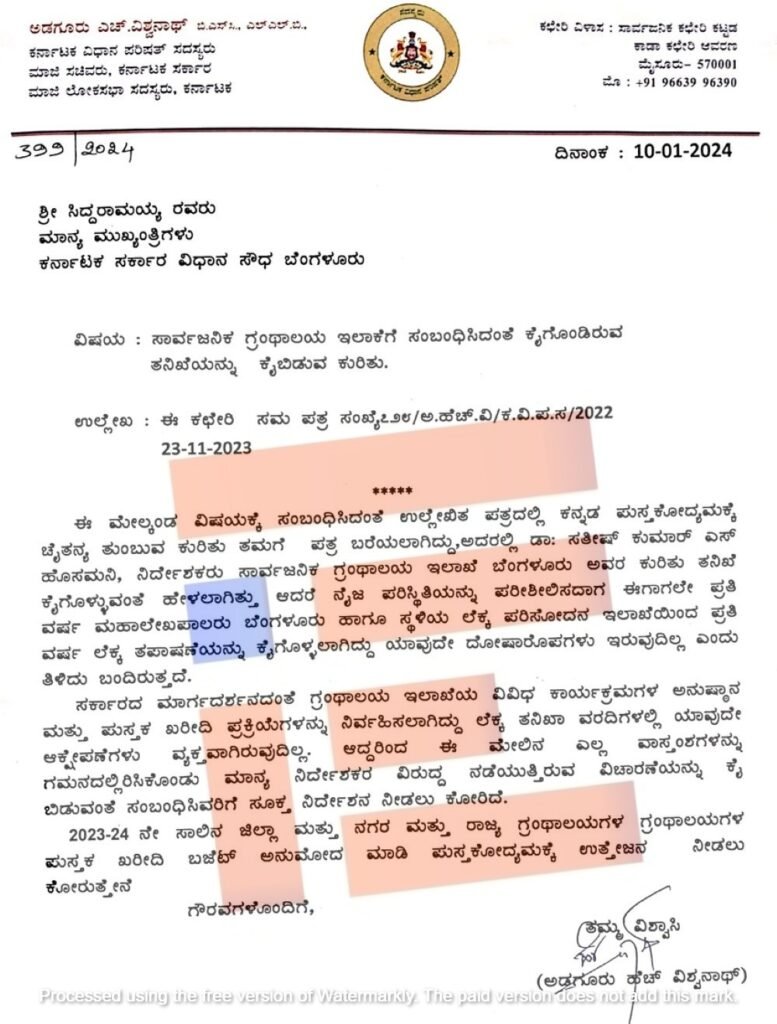 ಗ್ರಂಥಾಲಯ ಇಲಾಖೆಗೆ ಸೆಸ್ ರೂಪದಲ್ಲಿ ಹಣ ಸಂಗ್ರಹವಾಗುತ್ತಿದ್ದು ಇಲಾಖೆಯು ಕಳೆದ ಮೂರು ವರ್ಷಗಳಲ್ಲಿ ಪುಸ್ತಕಗಳನ್ನು ಖರೀದಿಸಿರುವುದಿಲ್ಲ. ಈ ಸಂಬಂಧ ಯಾವುದೇ ಕ್ರಮವಹಿಸದೇ ಕೋಟ್ಯಂತರ ರುಪಾಯಿ ಹಣವನ್ನು ಡಿಜಿಟಲ್ ಗ್ರಂಥಾಲಯದ ಹೆಸರಿನಲ್ಲಿ ಪೋಲು ಮಾಡುತ್ತಿರುವುದು ಸಾರ್ವಜನಿಕ ವಲಯದಲ್ಲಿ ಚರ್ಚೆಯಾಗುತ್ತಿದೆ. ಈ ಅಧಿಕಾರಿ ವಿರುದ್ಧ ನ್ಯಾಯಾಧೀಶರು ಅಥವಾ ಉನ್ನತ ಮಟ್ಟದ ಸಮಿತಿ ರಚಿಸಿ ಎಲ್ಲಾ ಚಟುವಟಿಕೆಗಳನ್ನು ಕೂಲಂಕಷವಾಗಿ ತನಿಖೆಗೊಳಪಡಿಸಬೇಕು ಎಂದು ವಿಧಾನಪರಿಷತ್ ಸದಸ್ಯ ಹೆಚ್ ವಿಶ್ವನಾಥ್ ಕೋರಿದ್ದಾರೆ.