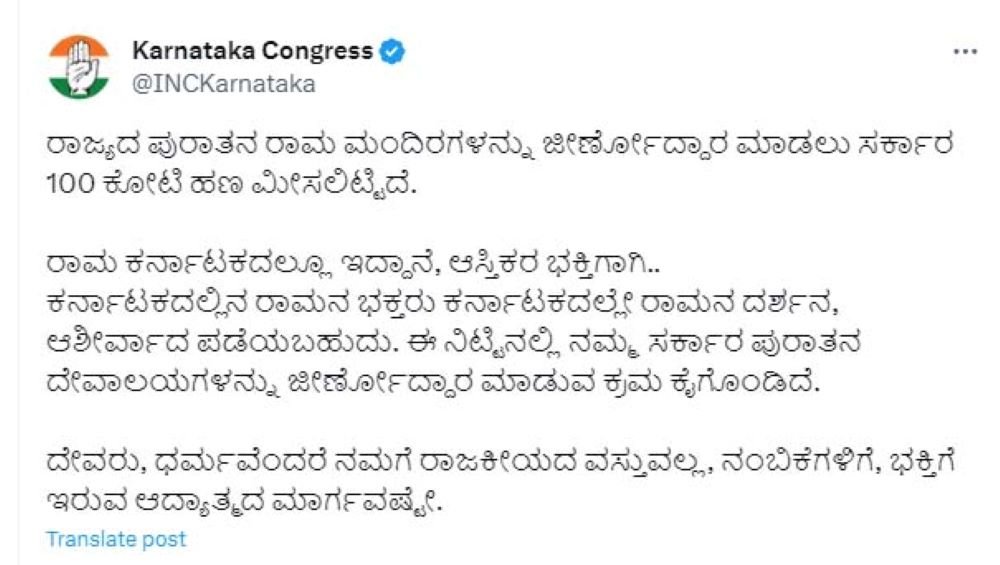 ‘ರಾಜ್ಯದ ಪುರಾತನ ರಾಮ ಮಂದಿರಗಳನ್ನು ಜೀರ್ಣೋದ್ದಾರ ಮಾಡಲು ಸರ್ಕಾರ 100 ಕೋಟಿ ಹಣ ಮೀಸಲಿಟ್ಟಿದೆ. ರಾಮ ಕರ್ನಾಟಕದಲ್ಲೂ ಇದ್ದಾನೆ, ಆಸ್ತಿಕರ ಭಕ್ತಿಗಾಗಿ.. ಕರ್ನಾಟಕದಲ್ಲಿನ ರಾಮನ ಭಕ್ತರು ಕರ್ನಾಟಕದಲ್ಲೇ ರಾಮನ ದರ್ಶನ, ಆಶೀರ್ವಾದ ಪಡೆಯಬಹುದು. ಈ ನಿಟ್ಟಿನಲ್ಲಿ ನಮ್ಮ ಸರ್ಕಾರ ಪುರಾತನ ದೇವಾಲಯಗಳನ್ನು ಜೀರ್ಣೋದ್ದಾರ ಮಾಡುವ ಕ್ರಮ ಕೈಗೊಂಡಿದೆ. ದೇವರು, ಧರ್ಮವೆಂದರೆ ನಮಗೆ ರಾಜಕೀಯದ ವಸ್ತುವಲ್ಲ, ನಂಬಿಕೆಗಳಿಗೆ, ಭಕ್ತಿಗೆ ಇರುವ ಆದ್ಯಾತ್ಮದ ಮಾರ್ಗವಷ್ಟೇ,’ ಎಂದು ಸರ್ಕಾರದ ಕ್ರಮವನ್ನು ಸಮರ್ಥಿಸಿಕೊಂಡಿದೆ.