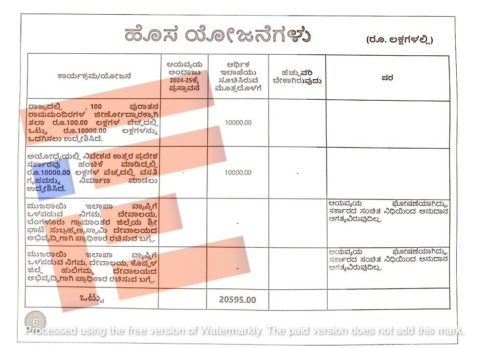 ಇದೇ ಫೆಬ್ರುವರಿ-ಮಾರ್ಚ್‌ನಲ್ಲಿ ಮಂಡಿಸಲಿರುವ 2024-25ನೇ ಸಾಲಿನ ಆಯವ್ಯಯದಲ್ಲಿ ಪುರಾತನ ರಾಮ ಮಂದಿರ ಜೀರ್ಣೋದ್ಧಾರ ಮತ್ತು ಅಯೋಧ್ಯೆಯಲ್ಲಿ ಬೃಹತ್‌ ವಸತಿ ಗೃಹ ನಿರ್ಮಾಣ ಮಾಡಲು ಮುಖ್ಯಮಂತ್ರಿ ಸಿದ್ದರಾಮಯ್ಯ ಅವರು ಘೋಷಿಸಲಿದ್ದಾರೆ ಎಂದು ತಿಳಿದು ಬಂದಿದೆ.