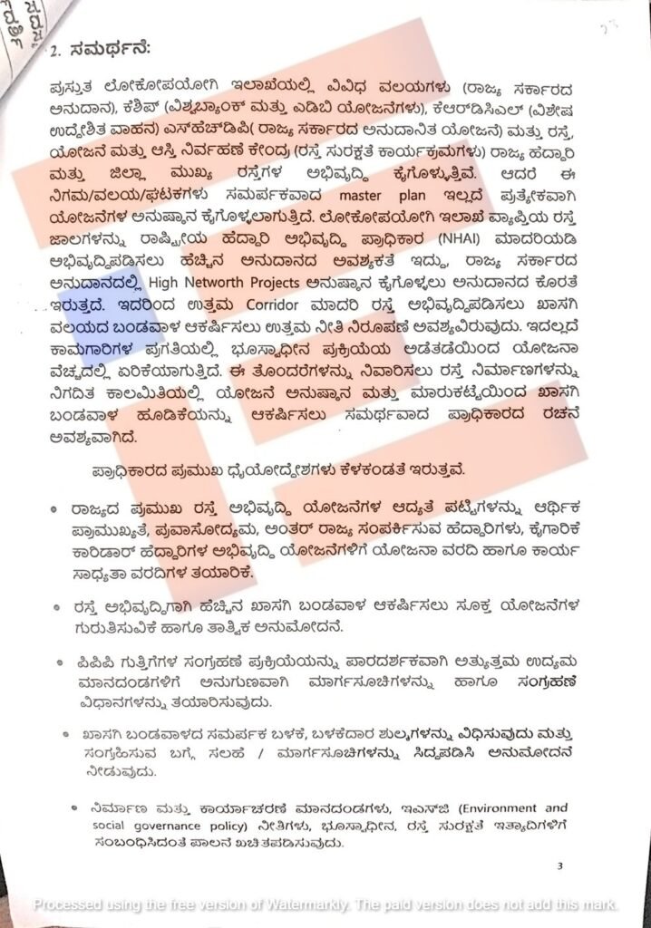 ಲೋಕೋಪಯೋಗಿ ಇಲಾಖೆಯಲ್ಲಿ ವಿವಿಧ ವಲಯಗಳು (ರಾಜ್ಯ ಸರ್ಕಾರದ ಅನುದಾನ) ಕೆಶಿಪ್ (ವಿಶ್ವ ಬ್ಯಾಂಕ್ ಮತ್ತು ಎಡಿಬಿ ಯೋಜನೆಗಳು) ಕೆಆರ್ಡಿಸಿಎಲ್ (ವಿಶೇಷ ಉದ್ದೇಶಿತ ವಾಹನ) ಎಸ್ಹೆಚ್ಡಿಪಿ (ರಾಜ್ಯ ಸರ್ಕಾರದ ಅನುದಾನಿತ ಯೋಜನೆ) ಮತ್ತು ರಸ್ತೆ ಯೋಜನೆ, ಆಸ್ತಿ ನಿರ್ವಹಣೆ, ಜಿಲ್ಲಾ ಮುಖ್ಯ ರಸ್ತೆಗಳು ಅಭಿವೃದ್ಧಿ ಕೈಗೊಳ್ಳುತ್ತಿವೆ. ಆದರೆ ಈ ನಿಗಮ, ವಲಯ, ಘಟಕಗಳು ಸಮರ್ಪಕವಾದ ಮಾಸ್ಟರ್ ಪ್ಲಾನ್ ಇಲ್ಲದೆಯೇ ಪ್ರತ್ಯೇಕವಾಗಿ ಯೋಜನೆಗಳ ಅನುಷ್ಠಾನ ಕೈಗೊಳ್ಳಲಾಗುತ್ತಿದೆ ಎಂದು ಸಂಪುಟದ ಟಿಪ್ಪಣಿಯಲ್ಲಿ ಹೇಳಲಾಗಿದೆ.