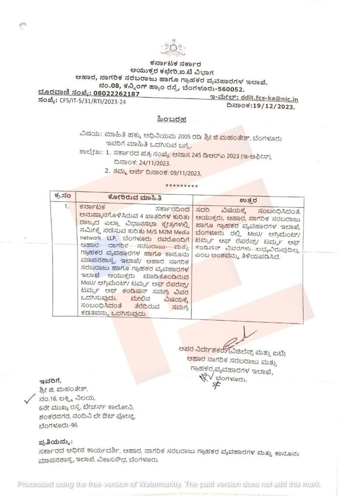 ಈ ಸಂಬಂಧ ಎಂ2ಎಂ ಮೀಡಿಯಾ ನೆಟ್ವರ್ಕ್ ಕಂಪನಿಯೊಂದಿಗೆ ಮಾಡಿಕೊಂಡಿರುವ ಎಂಒಯು, ಒಪ್ಪಂದ, ಟರ್ಮ್ಸ್ ಆಫ್ ರೆಫರೆನ್ಸ್, ಟರ್ಮ್ಸ್ ಆಫ್ ಕಂಡೀಷನ್ಸ್ ಸೇರಿದಂತೆ ಇನ್ನಿತರೆ ಸಮಗ್ರ ವಿವರ ಮತ್ತು ಸಮಗ್ರ ಕಡತವನ್ನು ಕೋರಿ ‘ದಿ ಫೈಲ್’ 2023ರ ನವೆಂಬರ್ 9ರಂದು ಆರ್ಟಿಐ ಅಡಿಯಲ್ಲಿ ಅರ್ಜಿ ಸಲ್ಲಿಸಿತ್ತು. ಈ ಅರ್ಜಿಯನ್ನು ಸರ್ಕಾರವು 2023ರ ನವೆಂಬರ್ 24ರಂದು ಆಯುಕ್ತರಿಗೆ ವರ್ಗಾಯಿಸಿತ್ತು.