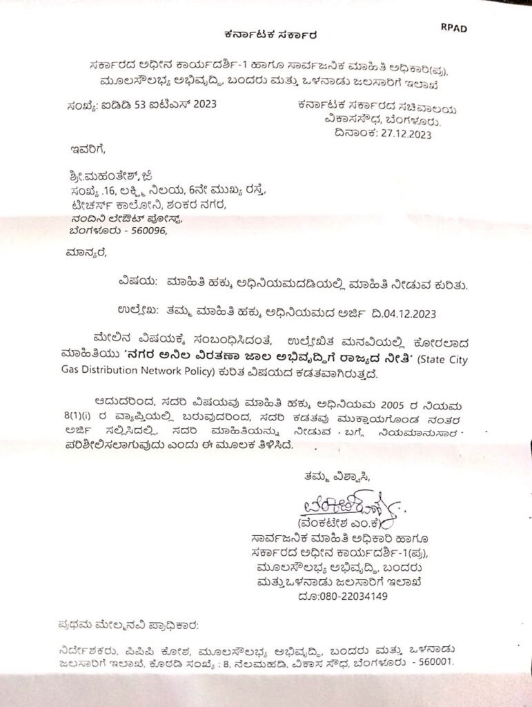 ಉಲ್ಲೇಖಿತ ಮನವಿಯಲ್ಲಿ ಕೋರಲಾದ ಮಾಹಿತಿಯು ನಗರ ಅನಿಲ ವಿತರಣಾ ಜಾಲ ಅಭಿವೃದ್ದಿಗೆ ರಾಜ್ಯದ ನೀತಿ ಕುರಿತ ವಿಷಯದ ಕಡತವಾಗಿರುತ್ತದೆ. ಆದ್ದರಿಂದ ಸದರಿ ವಿಷಯವು ಮಾಹಿತಿ ಹಕ್ಕು ಅಧಿನಿಯಮ 2005ರ ನಿಯಮ 8(1)(i) ರ ವ್ಯಾಪ್ತಿಯಲ್ಲಿ ಬರುವುದರಿಂದ ಸದರಿ ಕಡತವು ಮುಕ್ತಾಯಗೊಂಡ ನಂತರ ಅರ್ಜಿ ಸಲ್ಲಿಸಿದಲ್ಲಿ ಸದರಿ ಮಾಹಿತಿಯನ್ನು ನೀಡುವ ಬಗ್ಗೆ ನಿಯಮಾನುಸಾರ ಪರಿಶೀಲಿಸಲಾಗುವುದು ಎಂದು ಈ ಮೂಲಕ ತಿಳಿಸಿದೆ ಎಂದು 2023ರ ಡಿಸೆಂಬರ್ 27ರಂದು ಮೂಲ ಸೌಲಭ್ಯ ಅಭಿವೃದ್ಧಿ ಬಂದರು ಮತ್ತು ಒಳನಾಡು ಜಲಸಾರಿಗೆ ಇಲಾಖೆಯ ಸರ್ಕಾರದ ಅಧೀನ ಕಾರ್ಯದರ್ಶಿ ಎಂ ಕೆ ವೆಂಕಟೇಶ್ ಅವರು ಹಿಂಬರಹ ನೀಡಿದ್ದಾರೆ.