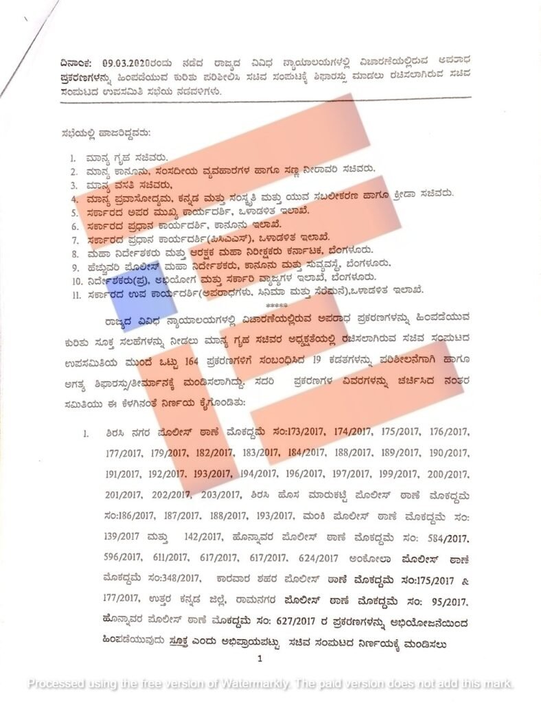 ರಾಜ್ಯದ ವಿವಿಧ ನ್ಯಾಯಾಲಯಗಳಲ್ಲಿ ವಿಚಾರಣೆಯಲ್ಲಿರುವ ಅಪರಾಧ ಪ್ರಕರಣಗಳನ್ನು ಹಿಂಪಡೆಯುವ ಕುರಿತು ಗೃಹ ಸಚಿವರಾಗಿದ್ದ ಬಸವರಾಜ ಬೊಮ್ಮಾಯಿ ಅವರ ನೇತೃತ್ವದ ಸಚಿವ ಸಂಪುಟ ಉಪ ಸಮಿತಿಯು 2020ರ ಮಾರ್ಚ್ 9ರಂದು ಸಭೆ ನಡೆಸಿತ್ತು. ಈ ಸಭೆಯಲ್ಲಿ ಒಟ್ಟು 164 ಪ್ರಕರಣಗಳಿಗೆ ಸಂಬಂಧಿಸಿದ 19 ಕಡತಗಳನ್ನು ಪರಿಶೀಲನೆಗಾಗಿ ಸಮಿತಿ ಮುಂದೆ ಇರಿಸಿತ್ತು.