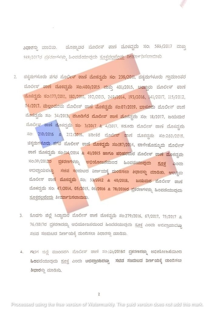 ‘ಚಿಕ್ಕಮಗಳೂರು ನಗರ ಪೊಲೀಸ್ ಠಾಣೆ ಮೊಕದ್ದಮೆ ಸಂಖ್ಯೆ 187/2014, ಬಾಳೆಹೊನ್ನೂರು ಪೊಲೀಸ್ ಠಾಣೆ ಮೊಕದ್ದಮೆ ಸಂಖ್ಯೆ 114/2014, 41/2015 ಹಾಗೂ ಹರಿಹರಪುರ ಪೊಲೀಸ್ ಠಾಣೆ ಮೊಕದ್ದಮೆ 39/2012ರ ಪ್ರಕರಣಗಳನ್ನು ಅಭಿಯೋಜನೆಯಿಂದ ಹಿಂಪಡೆಯುವುದು ಸೂಕ್ತ ಎಂದು ಅಭಿಪ್ರಾಯಪಟ್ಟು ಸಚಿವ ಸಂಪುಟ ನಿರ್ಣಯಕ್ಕೆ ಮಂಡಿಸಲು ಶಿಫಾರಸ್ಸು ಮಾಡಿತು,’ ಎಂದು ನಡವಳಿಯಲ್ಲಿ ದಾಖಲಿಸಿರುವುದು ಗೊತ್ತಾಗಿದೆ.