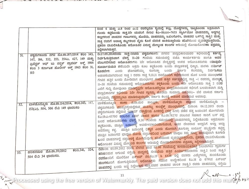 ಆರೋಪಿತರ ವಿರುದ್ಧ ಪ್ರಕರಣ ದಾಖಲಿಸಿಕೊಂಡಿದ್ದ ಪೊಲೀಸರು ಐಪಿಸಿ 143, 147, 153(ಎ), 504, 506, ರೆ;ವಿ 149 ಅಡಿಯಲ್ಲಿ ದೋಷಾರೋಪಣೆ ಪಟ್ಟಿ ಸಲ್ಲಿಸಿದ್ದರು ಎಂಬುದು ದಾಖಲೆಯಿಂದ ತಿಳಿದು ಬಂದಿದೆ.