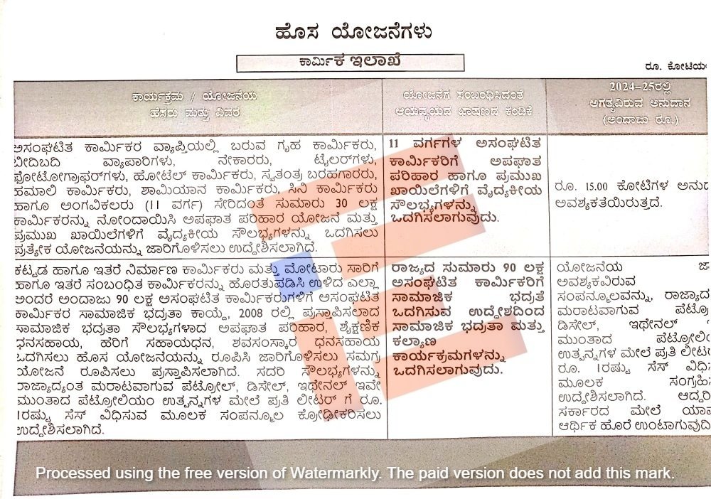 ಇದೇ ಫೆಬ್ರುವರಿಯಲ್ಲಿ ಮುಖ್ಯಮಂತ್ರಿ ಸಿದ್ದರಾಮಯ್ಯ ಅವರು ಮಂಡಿಸಲಿರುವ 2024-25ನೇ ಸಾಲಿನ ಆಯವ್ಯಯದಲ್ಲಿ ಘೋಷಿಸಲಿದ್ದಾರೆ. ಕಾರ್ಮಿಕ ಇಲಾಖೆಯ ಹೊಸ ಯೋಜನೆಗಳ ಪಟ್ಟಿಯಲ್ಲಿ ಈ ಬಗ್ಗೆ ವಿಸ್ತೃತವಾಗಿ ಹೇಳಲಾಗಿದೆ. ಇದರ ಪ್ರತಿಯು ‘ದಿ ಫೈಲ್’ಗೆ ಲಭ್ಯವಾಗಿದೆ.