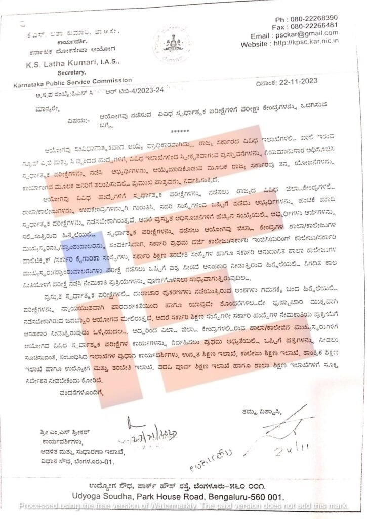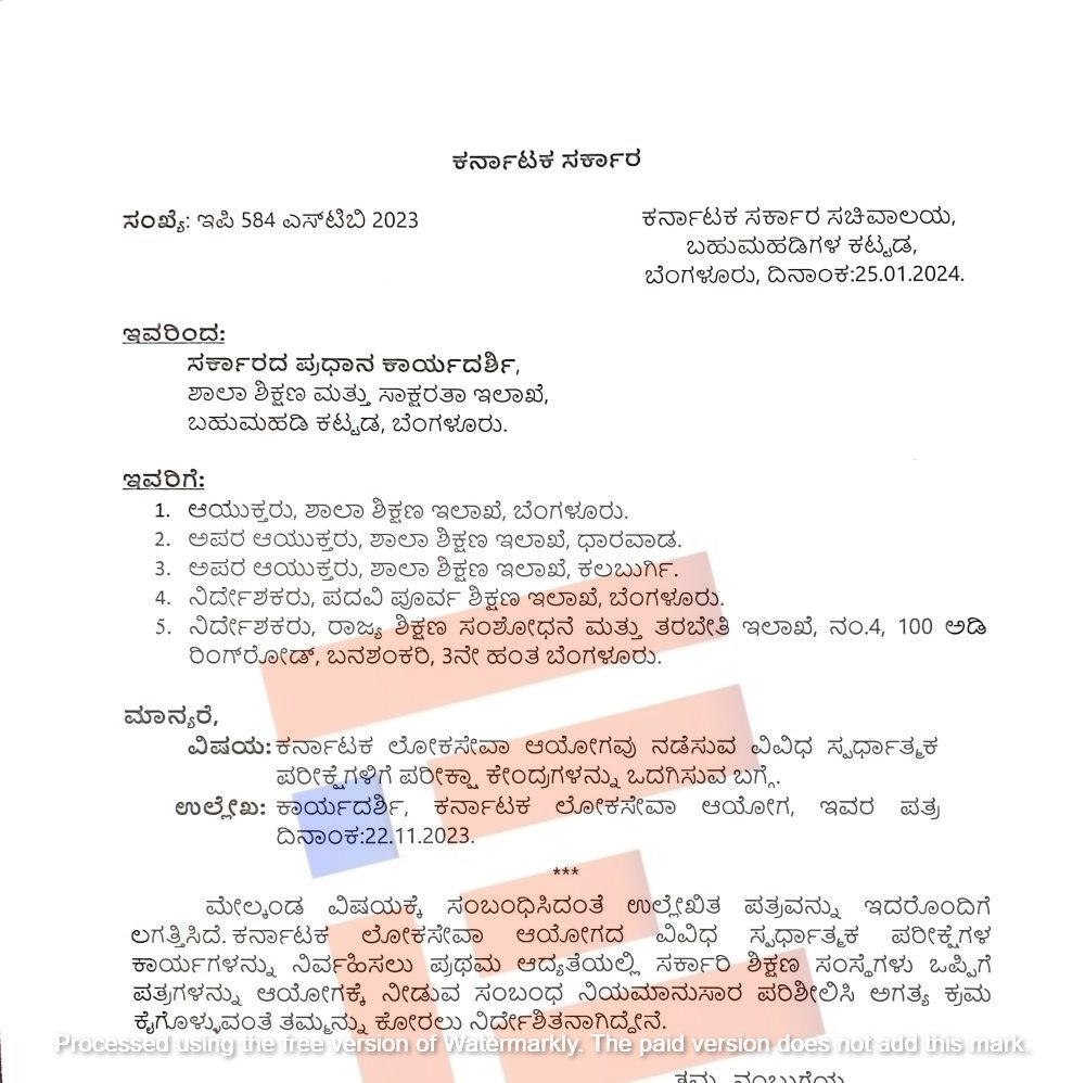 ‘ಕರ್ನಾಟಕ ಲೋಕಸೇವಾ ಆಯೋಗದ ವಿವಿಧ ಸ್ಪರ್ಧಾತ್ಮಕ ಪರೀಕ್ಷೆಗಳ ಕಾರ್ಯಗಳನ್ನು ನಿರ್ವಹಿಸಲು ಪ್ರಥಮ ಆದ್ಯತೆಯಲ್ಲಿ ಸರ್ಕಾರಿ ಶಿಕ್ಷಣ ಸಂಸ್ಥೆಗಳು ಒಪ್ಪಿಗೆ ಪತ್ರ ಆಯೋಗಕ್ಕೆ ನೀಡಬೇಕು. ಈ ಸಂಬಂಧ ನಿಯಮಾನುಸಾರ ಪರಿಶೀಲಿಸಿ ಅಗತ್ಯ ಕ್ರಮ ಕೈಗೊಳ್ಳಬೇಕು,’ ಎಂದು ಇಲಾಖೆಯ ಪ್ರಧಾನ ಕಾರ್ಯದರ್ಶಿಯು ನಿರ್ದೇಶಿಸಿದ್ದಾರೆ.