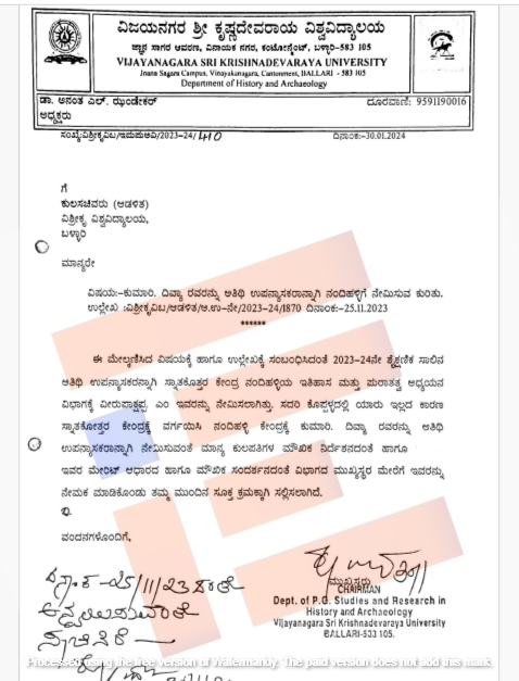 ಕುಲಪತಿಗಳ ಮೌಖಿಕ ಆದೇಶದಂತೆ, ಮೆರಿಟ್ ಹಾಗೂ ಮೌಖಿಕ ಸಂದರ್ಶನದಂತೆ ವಿಭಾಗದ ಮುಖ್ಯಸ್ಥರ ಶಿಫಾರಸಿನ ಮೇರೆಗೆ ಇವರನ್ನು ನೇಮಕ ಮಾಡಿಕೊಂಡು ಮುಂದಿನ ಸೂಕ್ತ ಕ್ರಮಕ್ಕಾಗಿ ಸಲ್ಲಿಸಲಾಗಿದೆ,’ ಎಂದು ಇತಿಹಾಸ ಮತ್ತು ಪುರಾತತ್ವ ವಿಭಾಗದ ಅಧ್ಯಕ್ಷರೂ ಆಗಿರುವ ಝಂಡೇಕರ್ ಸಹಿ ಹಾಕಿದ್ದಾರೆ.