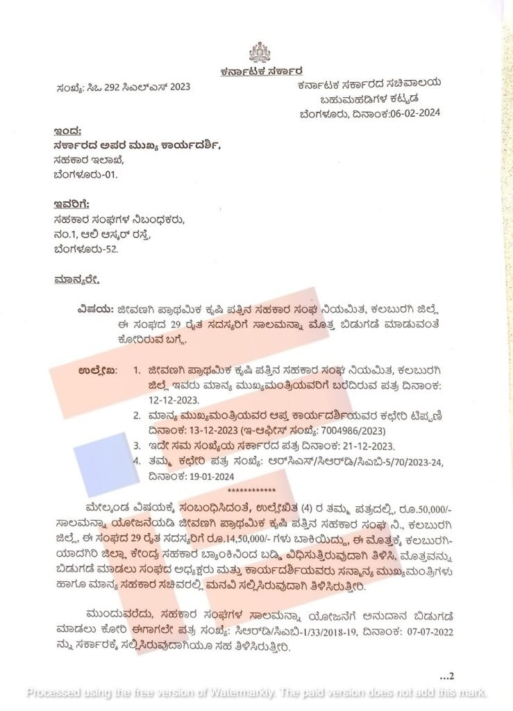 ಕಲ್ಬುರ್ಗಿ ಜಿಲ್ಲೆಯ ಕಮಲಾಪುರದ ಜೀವಣಗಿಯ ಪ್ರಾಥಮಿಕ ಕೃಷಿ ಪತ್ತಿನ ಸಹಕಾರ ಸಂಘದ 29 ರೈತ ಸದಸ್ಯರಿಗೆ ಸಾಲಮನ್ನಾ ಹಣವನ್ನು ಬಿಡುಗಡೆ ಮಾಡುವ ಸಂಬಂಧ ಸರ್ಕಾರಕ್ಕೆ ಪತ್ರ ಬರೆದಿತ್ತು. ಸಾಲ ಮನ್ನಾ ಯೋಜನೆಯಡಿ ಜೀವಣಗಿ ಪ್ರಾಥಮಿಕ ಕೃಷಿ ಪತ್ತಿನ ಸಹಕಾರ ಸಂಘದ 29 ರೈತ ಸದಸ್ಯರಿಗೆ (ತಲಾ 50,000) ಒಟ್ಟಾರೆ 14,50,500 ರು. ಬಾಕಿ ಇದೆ.