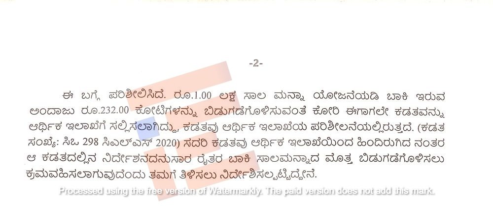 ಈ ಕುರಿತು ಸಹಕಾರ ಇಲಾಖೆಯು ಪ್ರಾಥಮಿಕ ಕೃಷಿ ಪತ್ತಿನ ಸಹಕಾರ ಸಂಘಗಳಿಗೆ ನೇರವಾಗಿ ಪತ್ರ ಬರೆಯುತ್ತಿದೆ. ಕಲ್ಬುರ್ಗಿ ಜಿಲ್ಲೆಯ ಕಮಲಾಪುರ ತಾಲೂಕಿನ ಜೀವಣಗಿಯ ಪ್ರಾಥಮಿಕ ಕೃಷಿ ಪತ್ತಿನ ಸಹಕಾರ ಸಂಘದ  ಪ್ರಕರಣದಲ್ಲಿ ಸಹಕಾರ ಸಂಘಗಳ ನಿಬಂಧಕರಿಗೆ 2024ರ ಫೆ.6ರಂದು ಪತ್ರವನ್ನು ಬರೆದಿದೆ. 1 ಲಕ್ಷ ವರೆಗಿನ ಸಾಲ ಮನ್ನಾ ಯೋಜನೆ ಮಾಡುವ ಸಂಬಂಧ 232 ಕೋಟಿ ರು, ಬಾಕಿ ಇದೆ ಎಂಬ ಸಂಗತಿಯನ್ನು ಇದೇ ಪತ್ರದಲ್ಲಿ ಸಹಕಾರ ಇಲಾಖೆಯ ಸರ್ಕಾರದ ಹೆಚ್ಚುವರಿ ಮುಖ್ಯ ಕಾರ್ಯದರ್ಶಿಗಳು  ಉಲ್ಲೇಖಿಸಿದ್ದಾರೆ. ಈ ಪತ್ರದ ಪ್ರತಿಯು ‘ದಿ ಫೈಲ್‌’ಗೆ ಲಭ್ಯವಾಗಿದೆ.