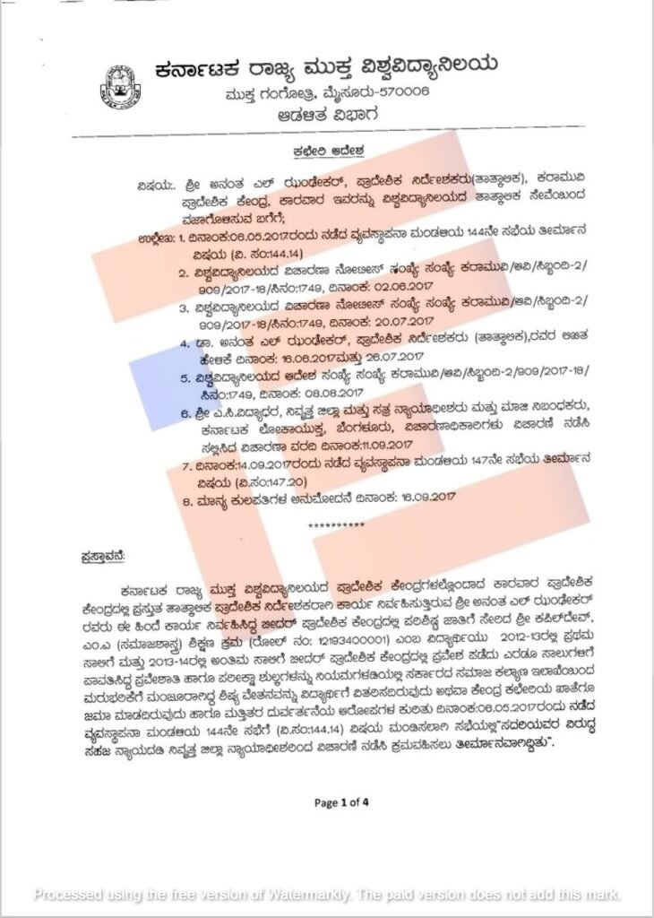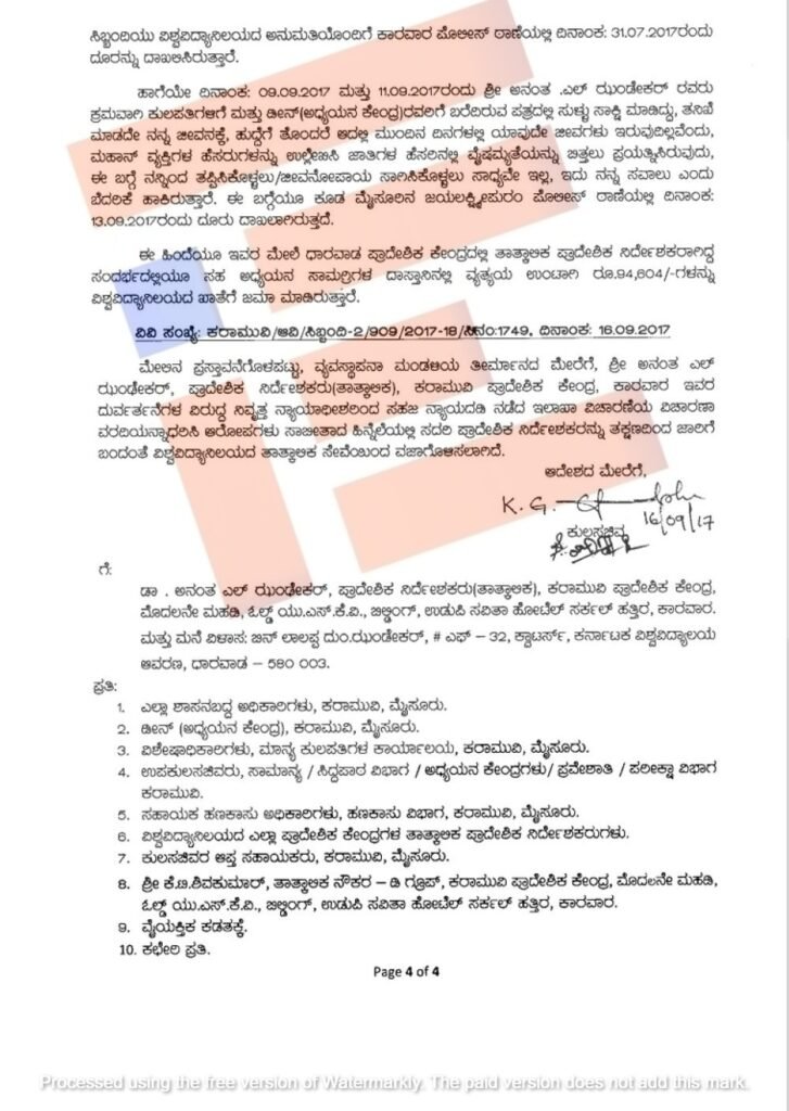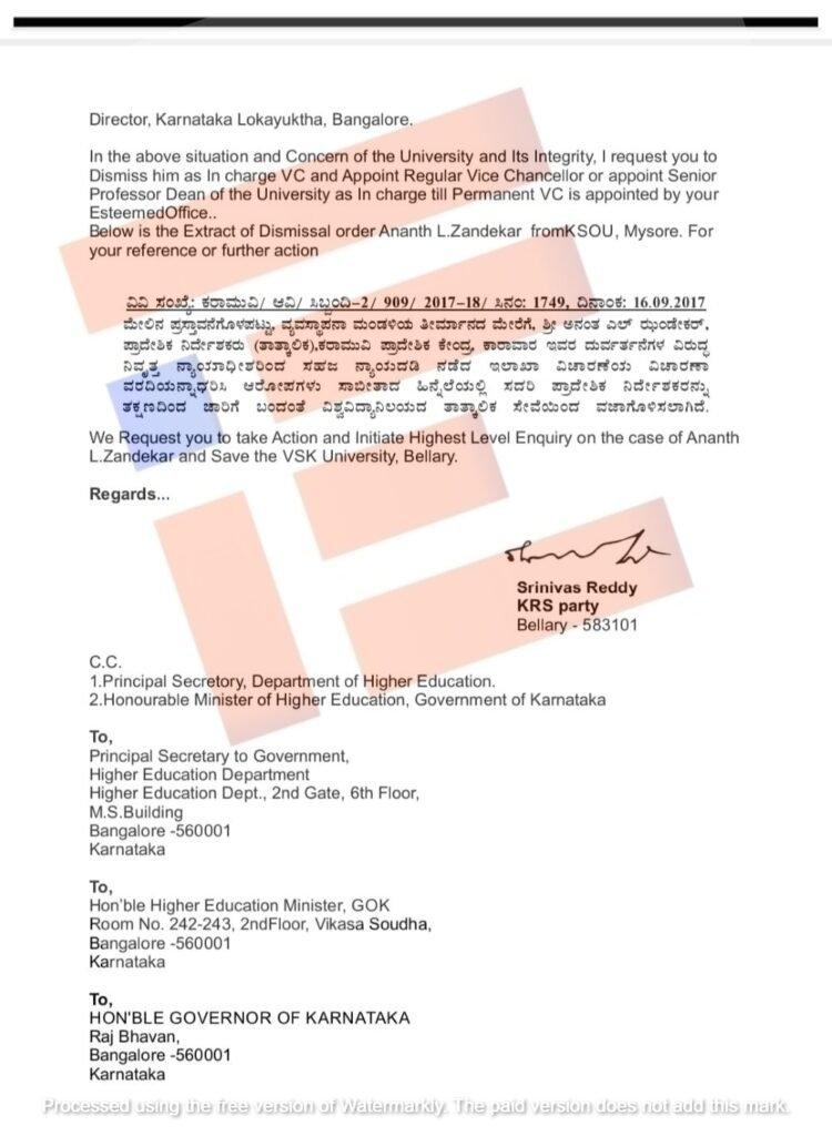 ಅನಂತ ಎಲ್. ಝಂಡೇಕರ್ ಅವರನ್ನು ಕಾರವಾರ ಪ್ರಾದೇಶಿಕ ಕೇಂದ್ರದ ತಾತ್ಕಾಲಿಕ ನಿರ್ದೇಶಕರ ಹುದ್ದೆಯಿಂದ ವಜಾಗೊಳಿಸಿದ ಕೆಎಸ್ಒಯು ಕಚೇರಿ ಆದೇಶಕ್ಕೆ ಕುಲಸಚಿವರು 2017ರ ಸೆಪ್ಟೆಂಬರ್ 16ರಂದು ಸಹಿ ಹಾಕಿದ್ದಾರೆ. ಈ ಆದೇಶ ಪ್ರತಿಯನ್ನು ರಾಜ್ಯಪಾಲರಿಗೆ ಬರೆದಿರುವ ಪತ್ರದ ಜತೆ ರೆಡ್ಡಿ ಲಗತ್ತಿಸಿದ್ದಾರೆ.