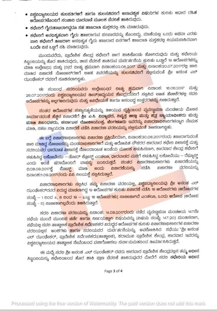 ಅನಂತ ಝಂಡೇಕರ್ ವಿರುದ್ಧ ಮಾಡಲಾದ ಒಟ್ಟು 19 ಆರೋಪಗಳ ವಿಚಾರಣೆಗೆ 2017ರ ಮೇ 6ರಂದು ನಡೆದ ವಿಶ್ವವಿದ್ಯಾಲಯದ ವ್ಯವಸ್ಥಾಪನಾ ಮಂಡಳಿಯ 144ನೇ ಸಭೆಯಲ್ಲಿ ಸಹಜ ನ್ಯಾಯದಡಿ ನಿವೃತ್ತ ಜಿಲ್ಲಾ ನ್ಯಾಯಾಧೀಶರಿಂದ ವಿಚಾರಣೆ ನಡೆಸಿ ಕ್ರಮ ವಹಿಸಲು ತೀರ್ಮಾನಿಸಲಾಗಿತ್ತು. ಅದರಂತೆ, ನಿವೃತ್ತ ಜಿಲ್ಲಾ ಹಾಗೂ ಸೆಷನ್ಸ್ ನ್ಯಾಯಾಧೀಶ ಮತ್ತು ಮಾಜಿ ನಿಬಂಧಕರು, ಕರ್ನಾಟಕ ಲೋಕಾಯುಕ್ತ ಎ.ಸಿ. ವಿದ್ಯಾಧರ ವಿಚಾರಣೆ ನಡೆಸಿ ವರದಿ ಸಲ್ಲಿಸಿದ್ದರು.